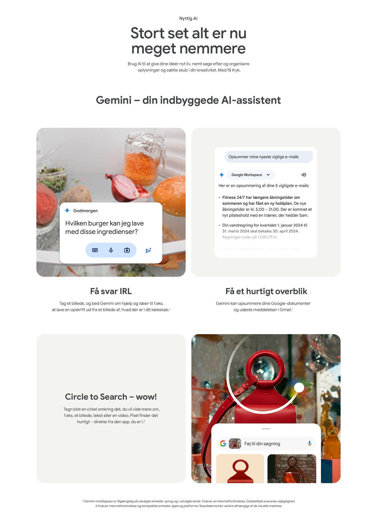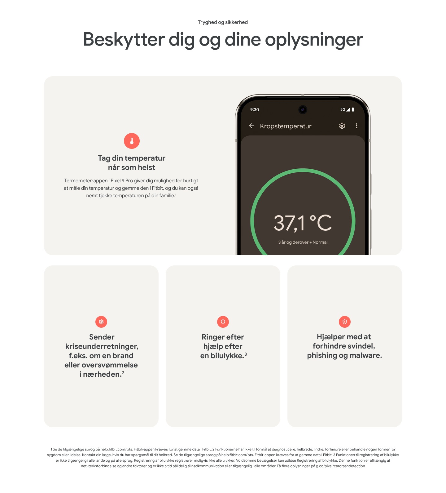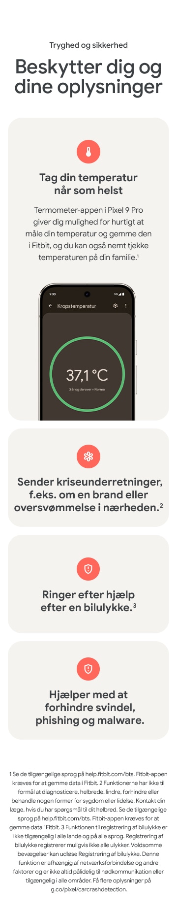 1 Prøveperioderne på Fitbit Premium og YouTube Premium er tilgængelige for kvalificerede brugere af de enkelte tjenester efter køb og aktivering af Pixel 9, inden tilbuddet udløber den 31. december 2025 kl. 23.59 CET. Efter endt prøveperiode overgår du automatisk til et betalt abonnement. Google One-tilbuddet (2 TB) er tilgængeligt for nye brugere, der køber og aktiverer Pixel 9 senest den 31. oktober 2025 kl. 23.59 CET og indløser tilbuddet inden den 15. november 2025 kl. 23.59 CET. En gyldig betalingsform er påkrævet ved tilmelding. 79 kr. pr. måned for Google One Premium-abonnementet (2 TB) og 69 kr. pr. måned for Fitbit Premium efter udløbet af de respektive 6-måneders prøveperioder samt 119 kr pr. måned for YouTube Premium efter udløbet af den 3-måneders prøveperiode. Kan opsiges når som helst inden overgangen til et betalt abonnement (og herefter til udgangen af den aktuelle faktureringsperiode). Returnering af en købt enhed kan føre til opsigelse af alle abonnementer. Fitbit Premium-indhold og -funktioner kan blive ændret. Se de komplette vilkår på youtube.com/premium/restrictions, one.google.com/offer/terms-and-conditions/pixel9 og g.co/fitbitpremium/tos.