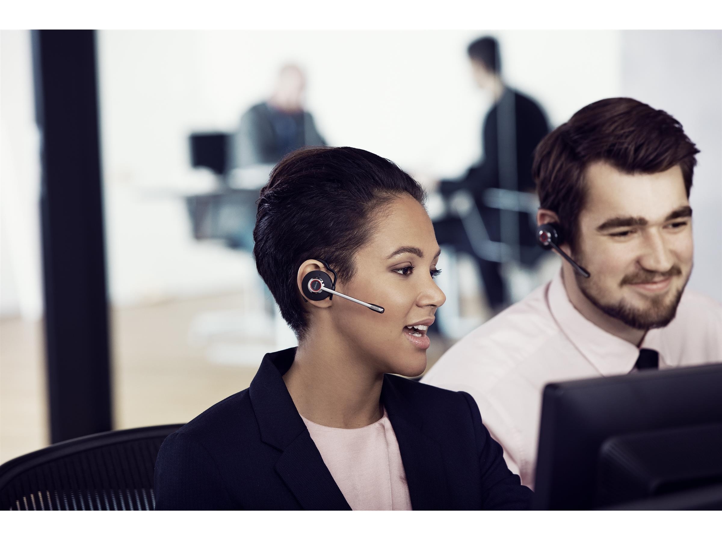Du kan frit bevæge dig rundt med Jabra Engage 75 Stereo med rækkevidde på op til 150 meter. Jabra Engage serien anvender også en DECT-standard, der kan håndtere langt flere headsets i samme rum, så du er beskyttet mod interferens fra andre brugere.