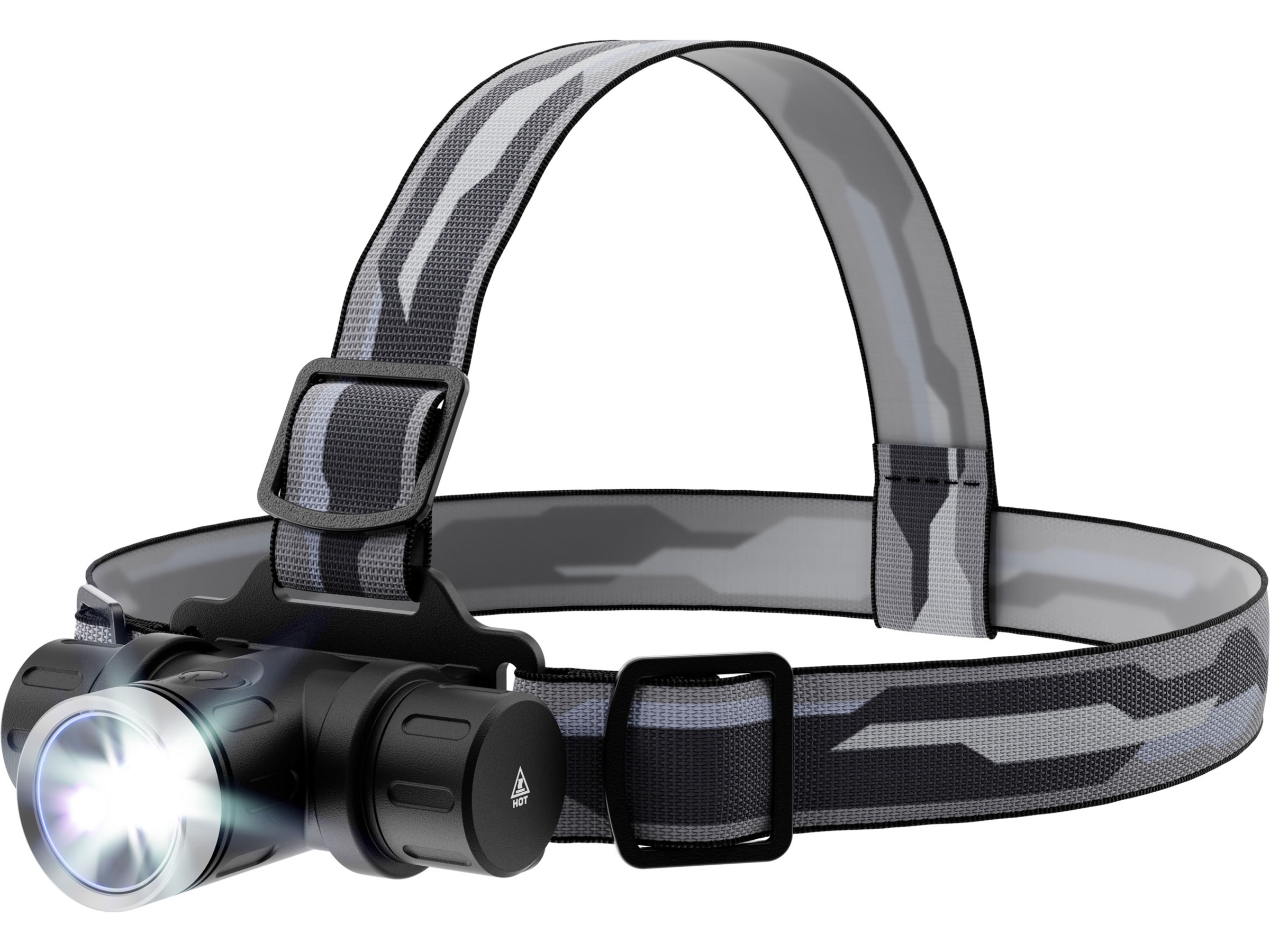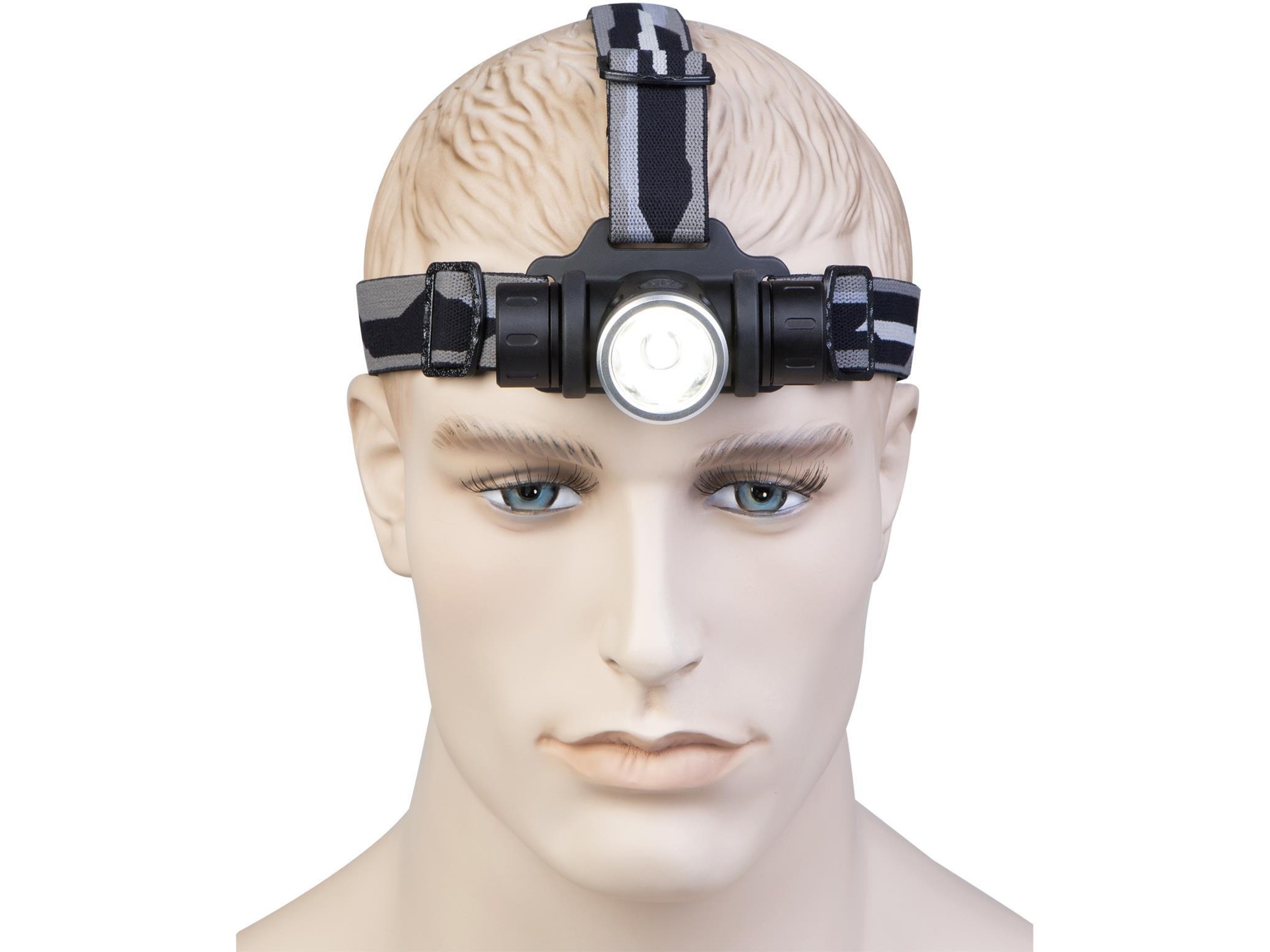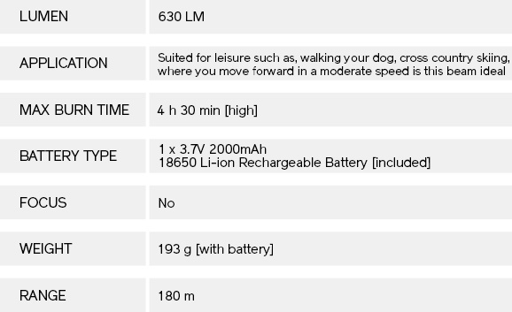 Pandelampen vejer 193 gram inklusive batteri. Et fast og elastisk hovedbånd holder lampen på plads under aktivitet.