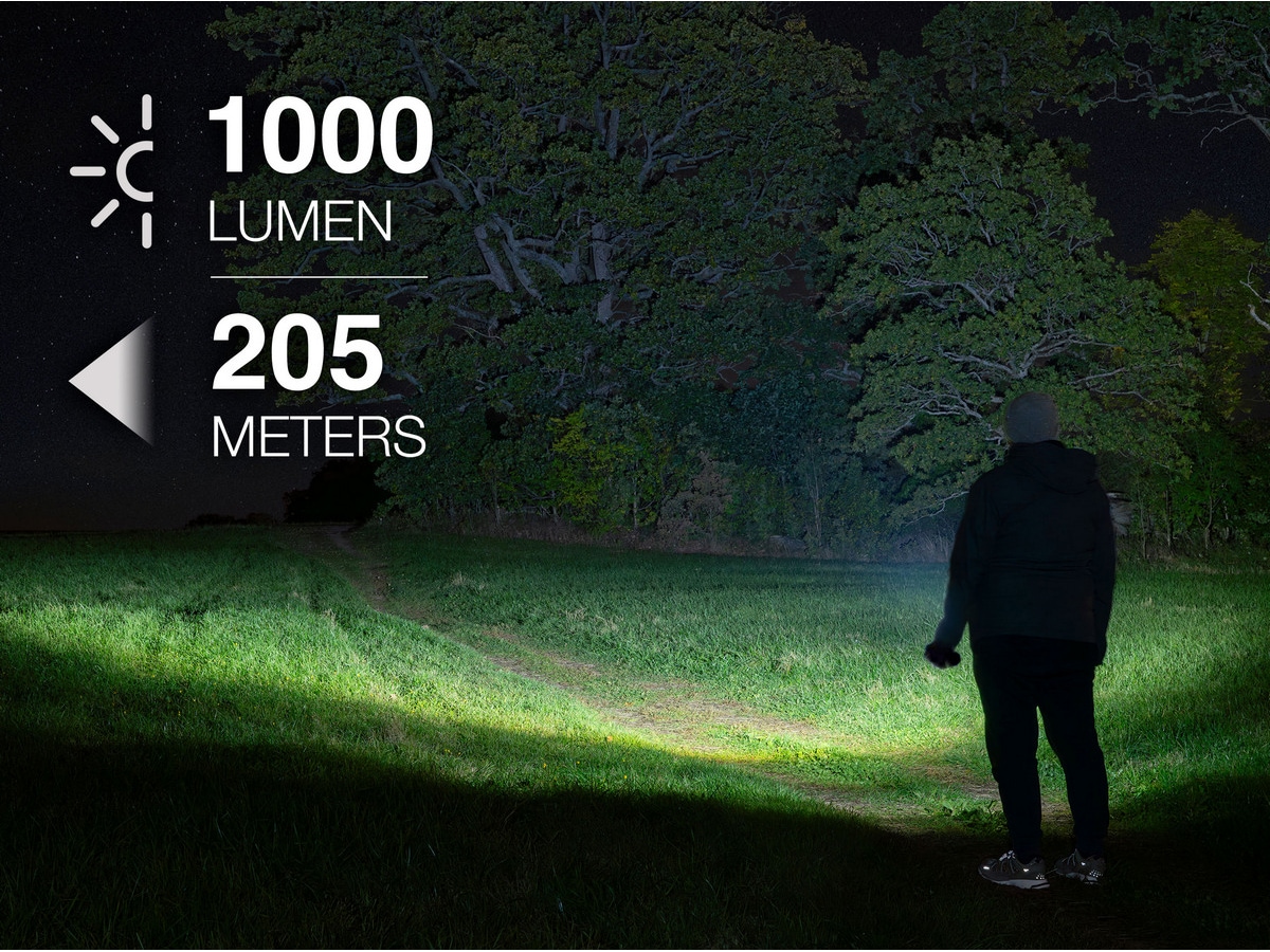Denne meget kraftfulde lommelygte har fem forskellige belysningstilstande, som du nemt kan skifte mellem med et enkelt klik. Lampen har også et fokussystem, som gør, at du med en enkelt glidende en-hånds-bevægelse kan justere lyskeglens spredning. Stavlygten har en linse, der giver et ensartet og klart lys, og ved maksimal styrke har den en meget god rækkevidde på hele 205 meter.