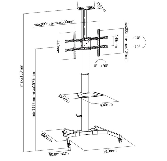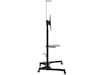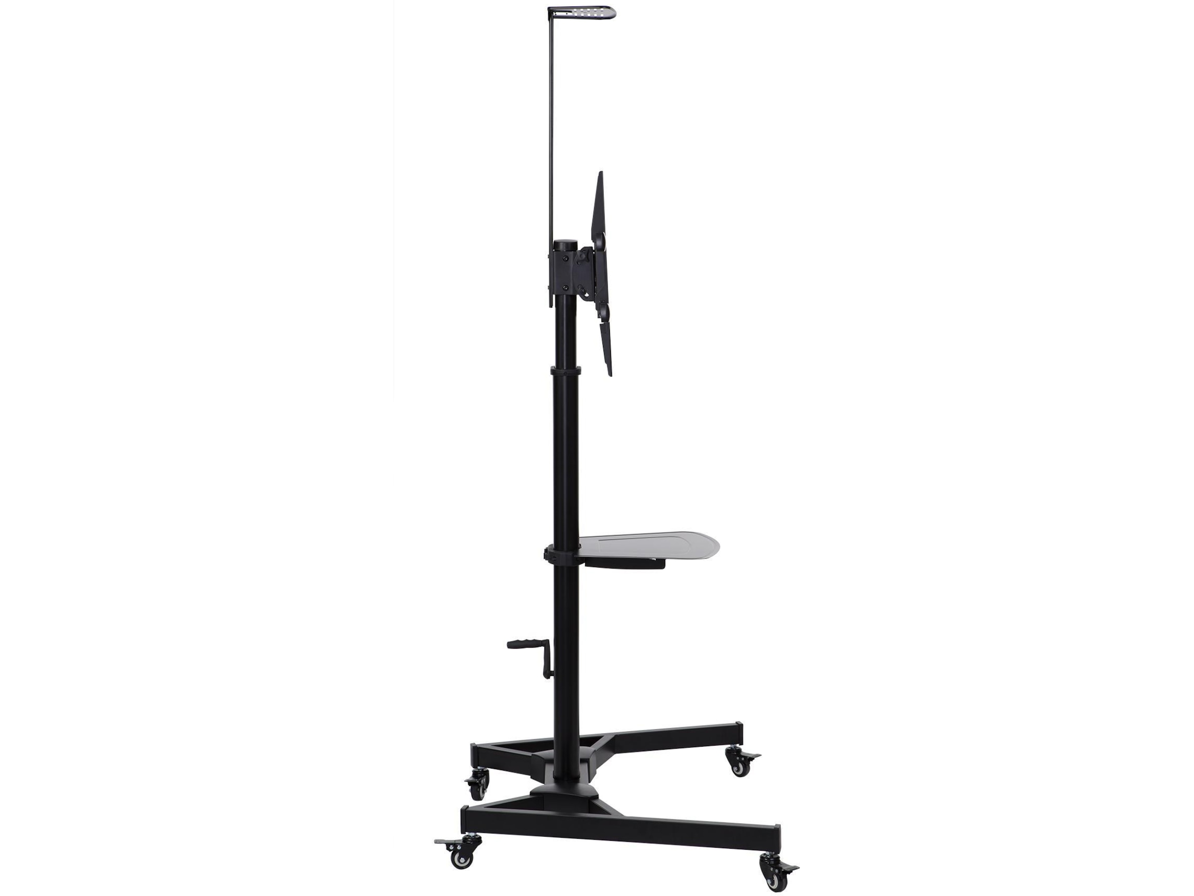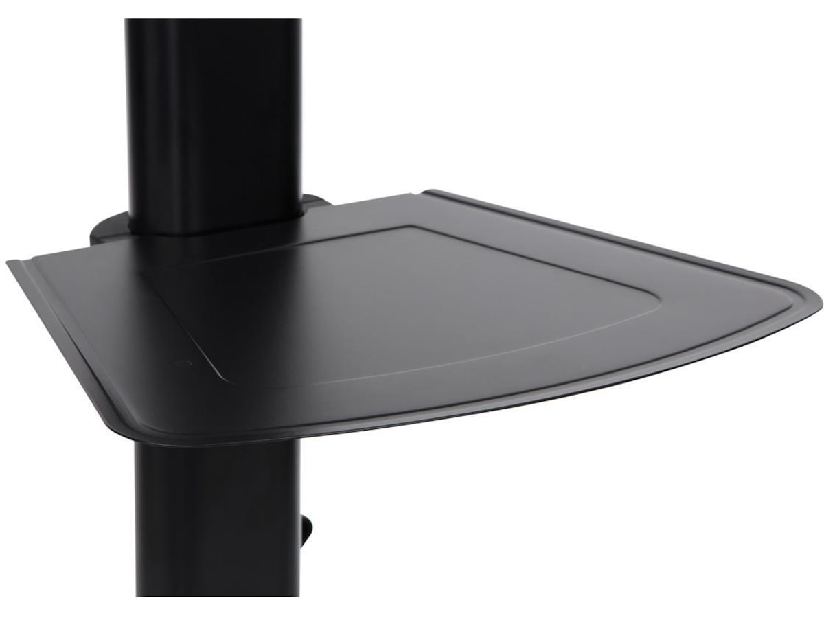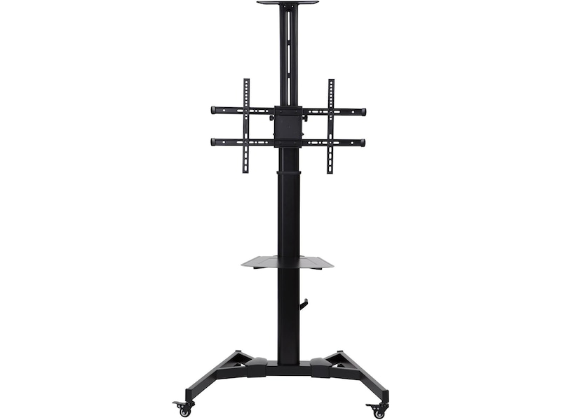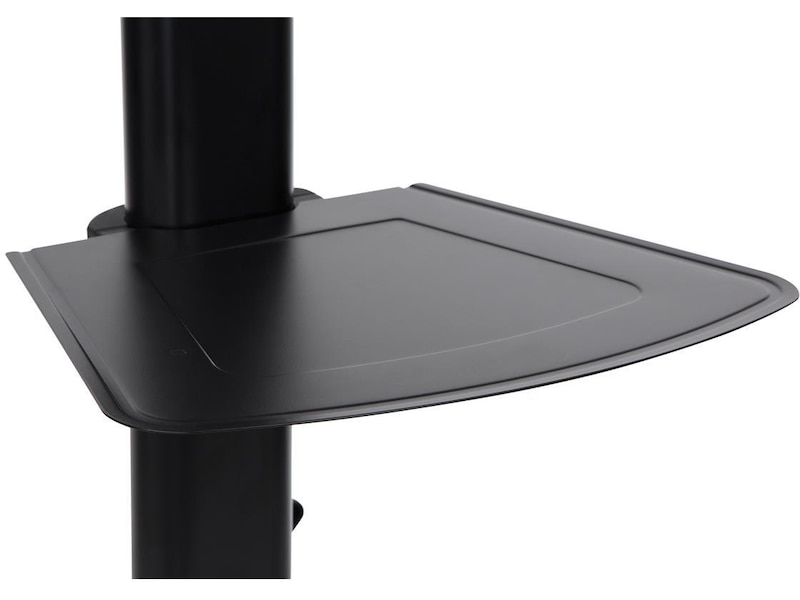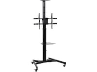TV-trolleyen leveres med to praktiske hylder. Den ene er egnet til en bærbar computer, og du kan bestemme, hvad højde det skal være. Den anden er placeret over fladskærmen med mulighed for webcam. Du kan vælge, om du vil sætte disse hylder på. Skærmen, du monterer, kan vippes for optimal betragtningsvinkel. Det er også muligt at montere til offentlig visning i portrætformat, og både flade og buede skærme kan monteres. Med mange monteringsmuligheder, højde og hjulsæt giver denne trolley dig en masse fleksibilitet og mobilitet.