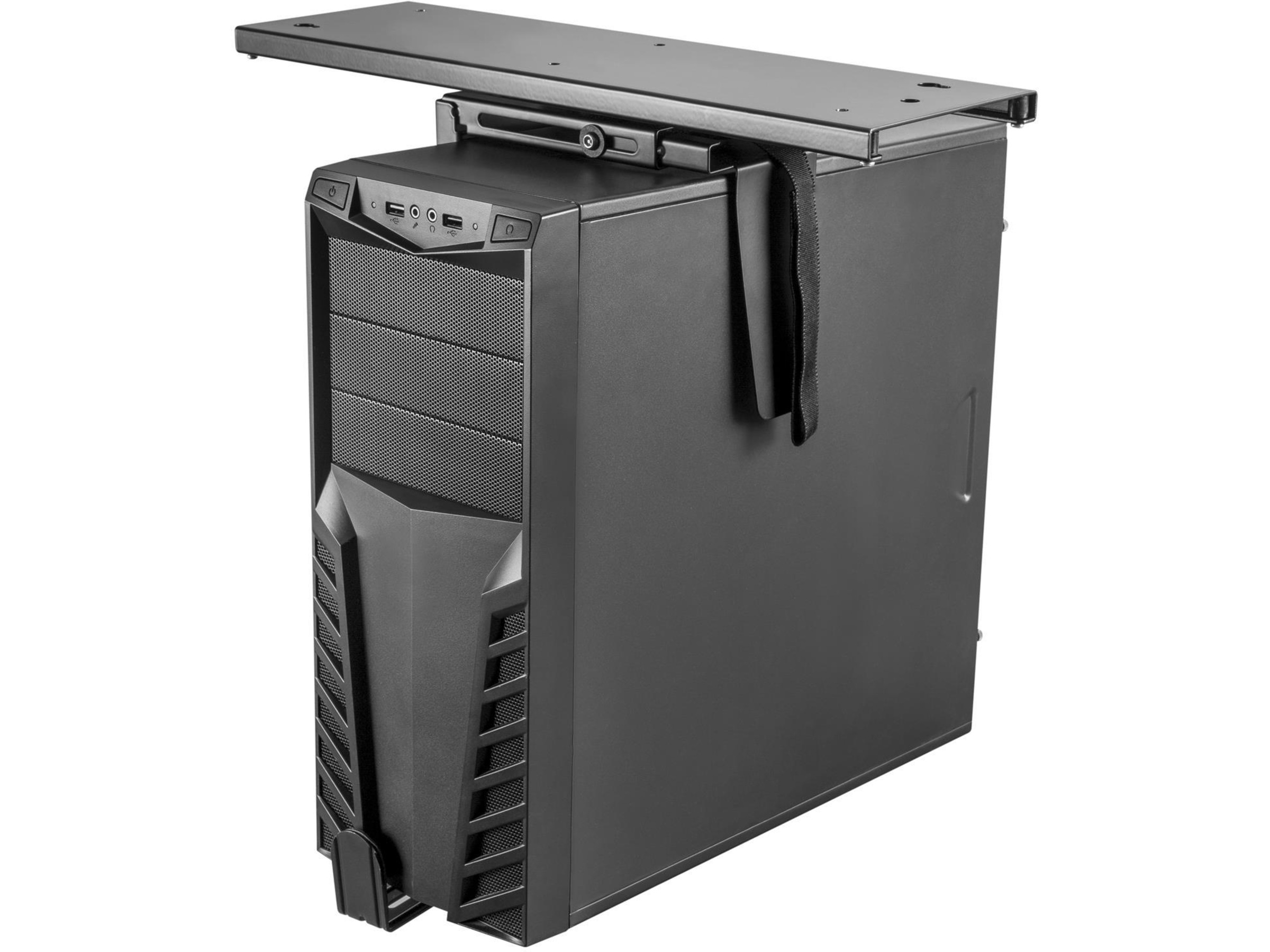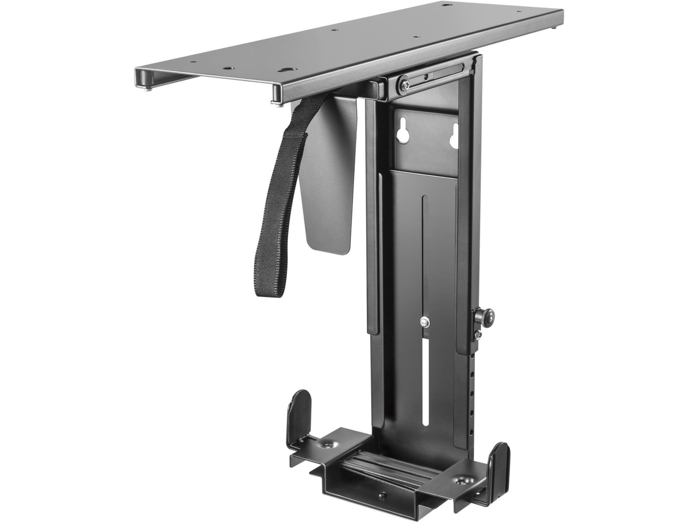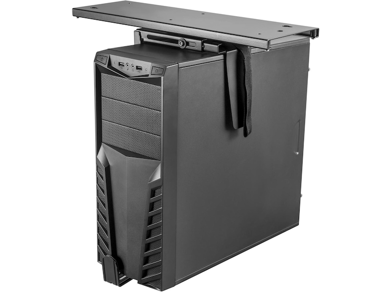 Dette er en solid CPU-holder, der hæver din computer over jorden og monterer den sikkert under skrivebordet. Nyd en kabel-fri overgang; beskyt computeren ved at få den væk fra jorden og væk fra støv og snavs. Tyverisikringsløsningen gør det muligt for et firma at låse din PC med en speciel skrue, så kun du kan åbne holderen. Herudover passer det bredde- og højdejusterbare design til de fleste computerkabinetter.