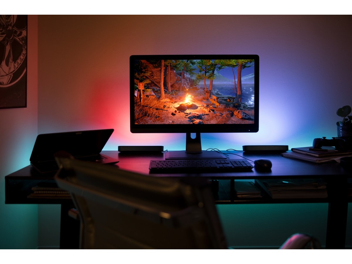 Brug den i dit TV-område, ved dit gaming setup og i alle hjemmets rum for at skabe farverige lyseffekter, der løfter enhver underholdningsoplevelse til nye højder. Den slanke lampe kan både stå op og monteres enten på væggen eller bag på dit TV eller din computerskærm.