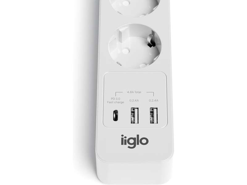 Strømpladen er udstyret med to ekstra USB-A porter, hver med en 2,4 A-udgang.