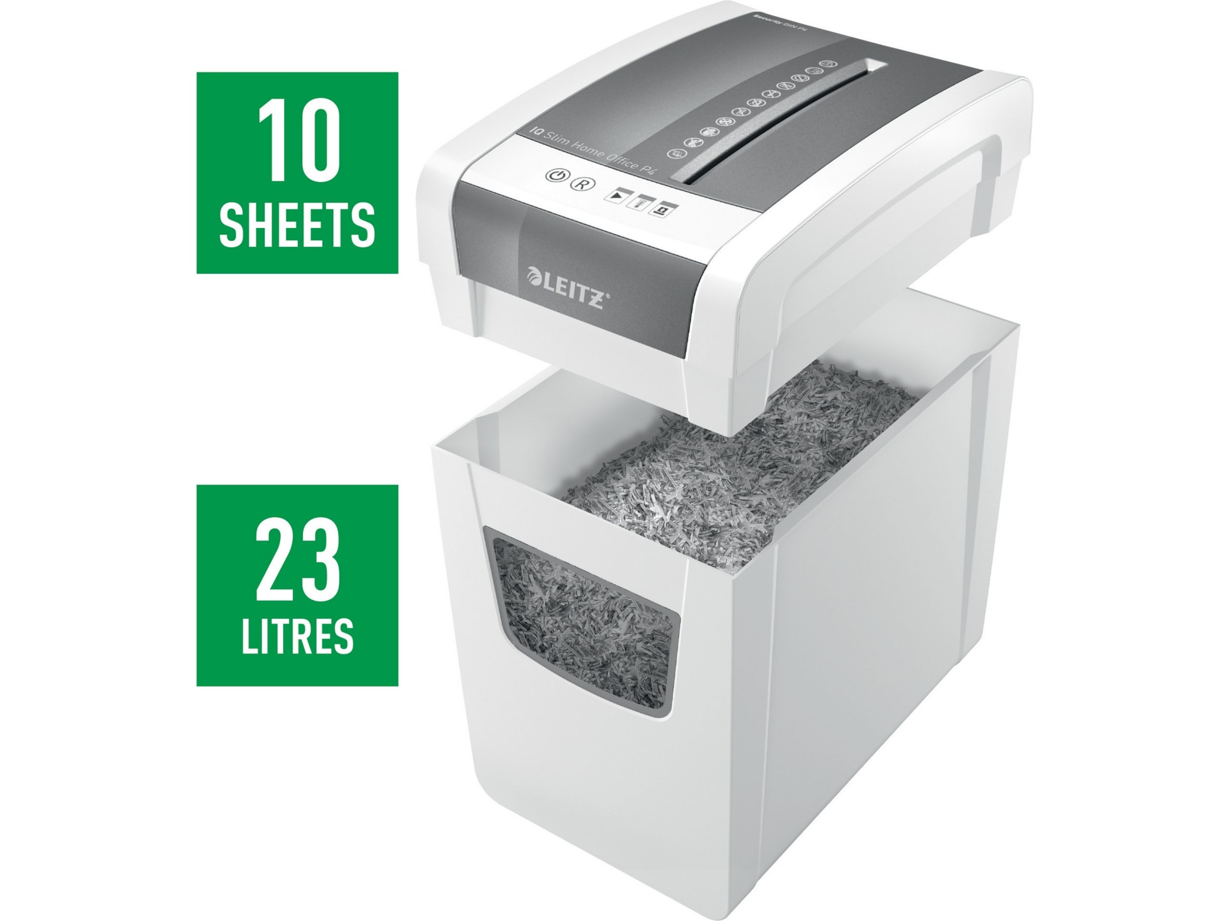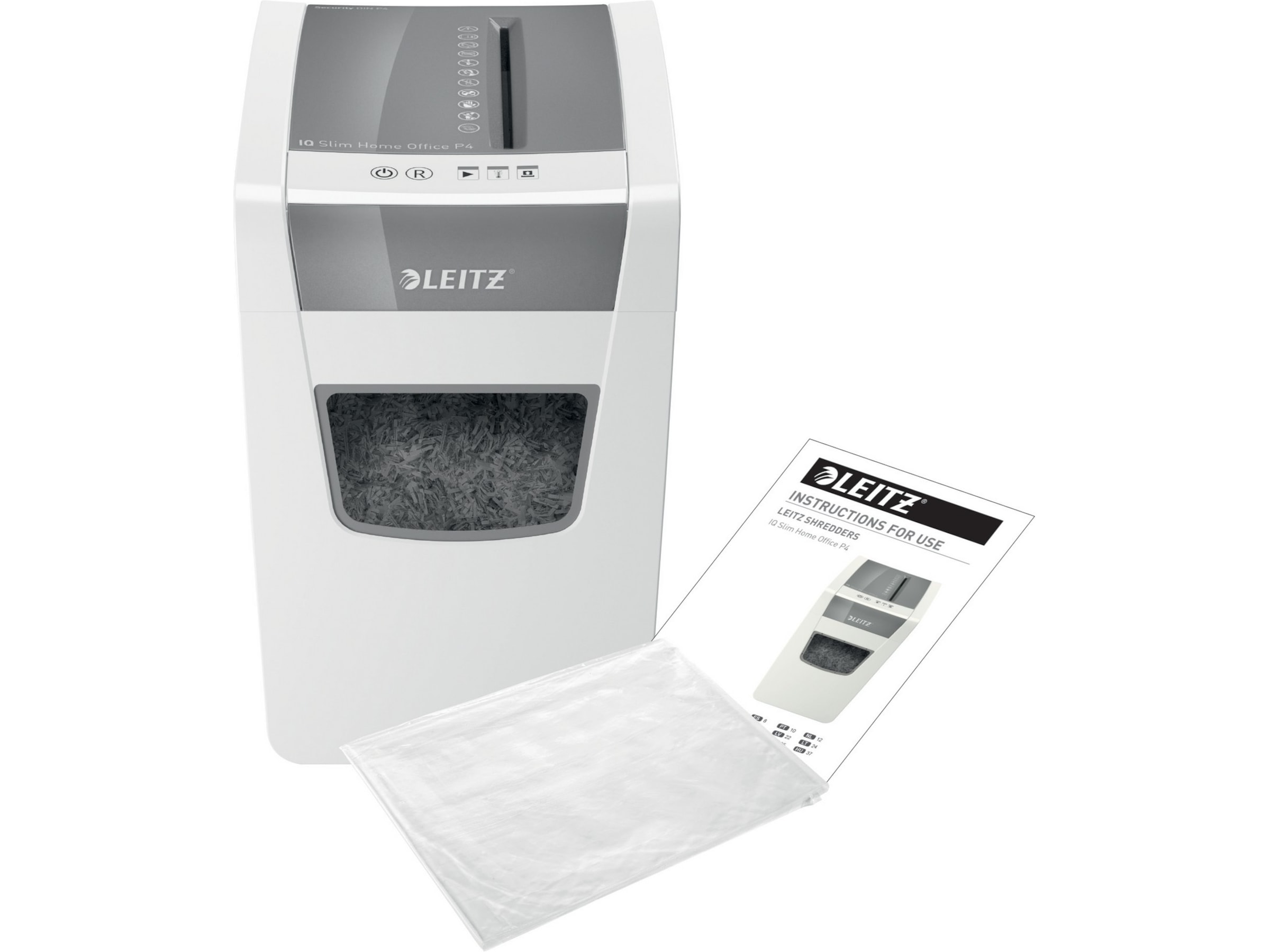 Slank og elegant makulator fra Leitz. Let at placere og perfekt til brug på dit hjemmekontor. Anti-stop-funktion, støjsvag drift og lang levetid. Makulerer op til 10 A4-ark. 23 liters beholder. Let at bruge med touch-panel. Sikkerhedsniveau P4 giver sikkerhed for, at personlige dokumenter bliver sikkert destrueret. Sikker børnesikring. Ekstra støjsvag drift giver et roligt arbejdsmiljø (kræver regelmæssig brug af Leitz olieark)