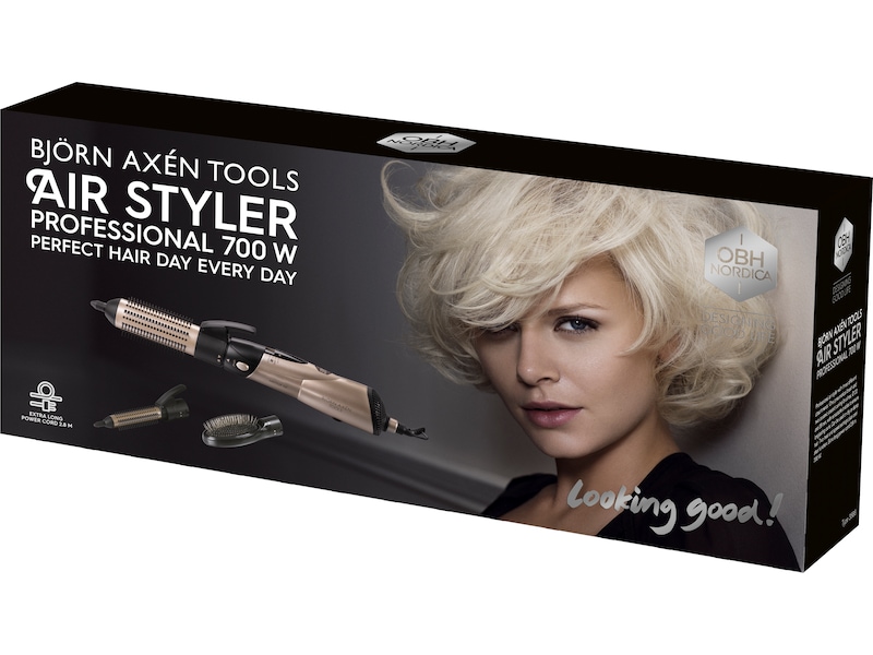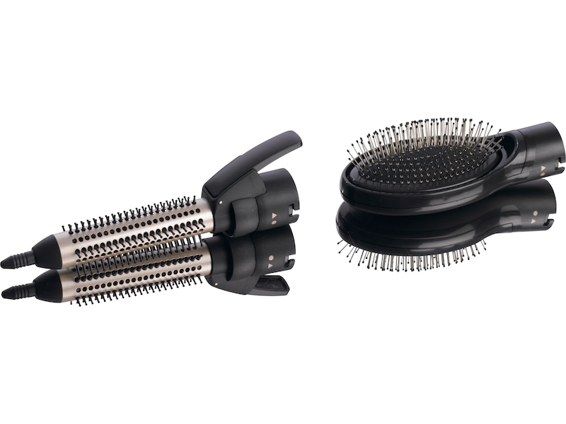Professionel varmluftsbørste med 3 udskiftelige tilbehørsdele: 2 rundbørster og 1 hårbørste.