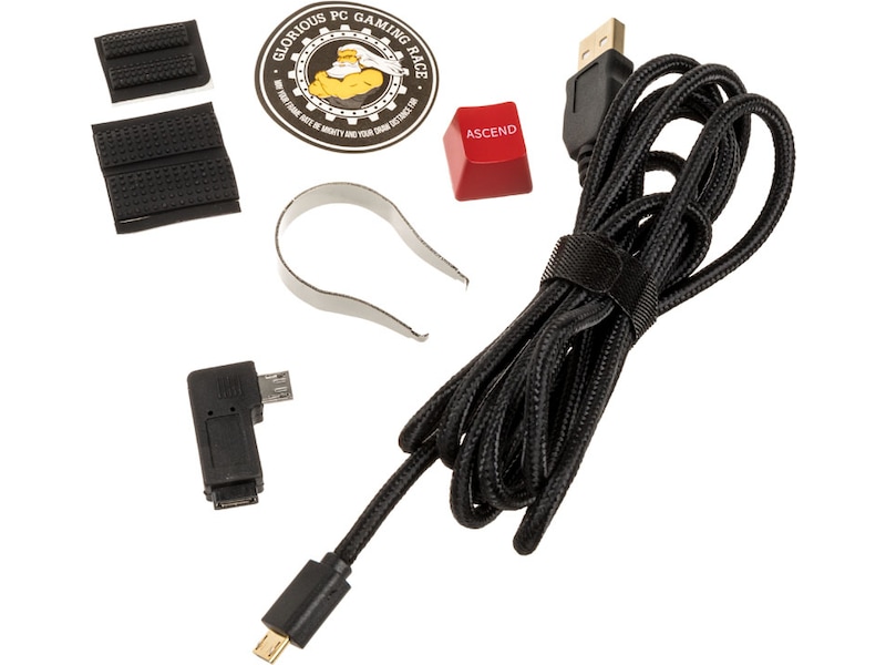 Glorious mærkat, keycap aftrækker, switch aftrækker værktøj og standard ESC-taster.