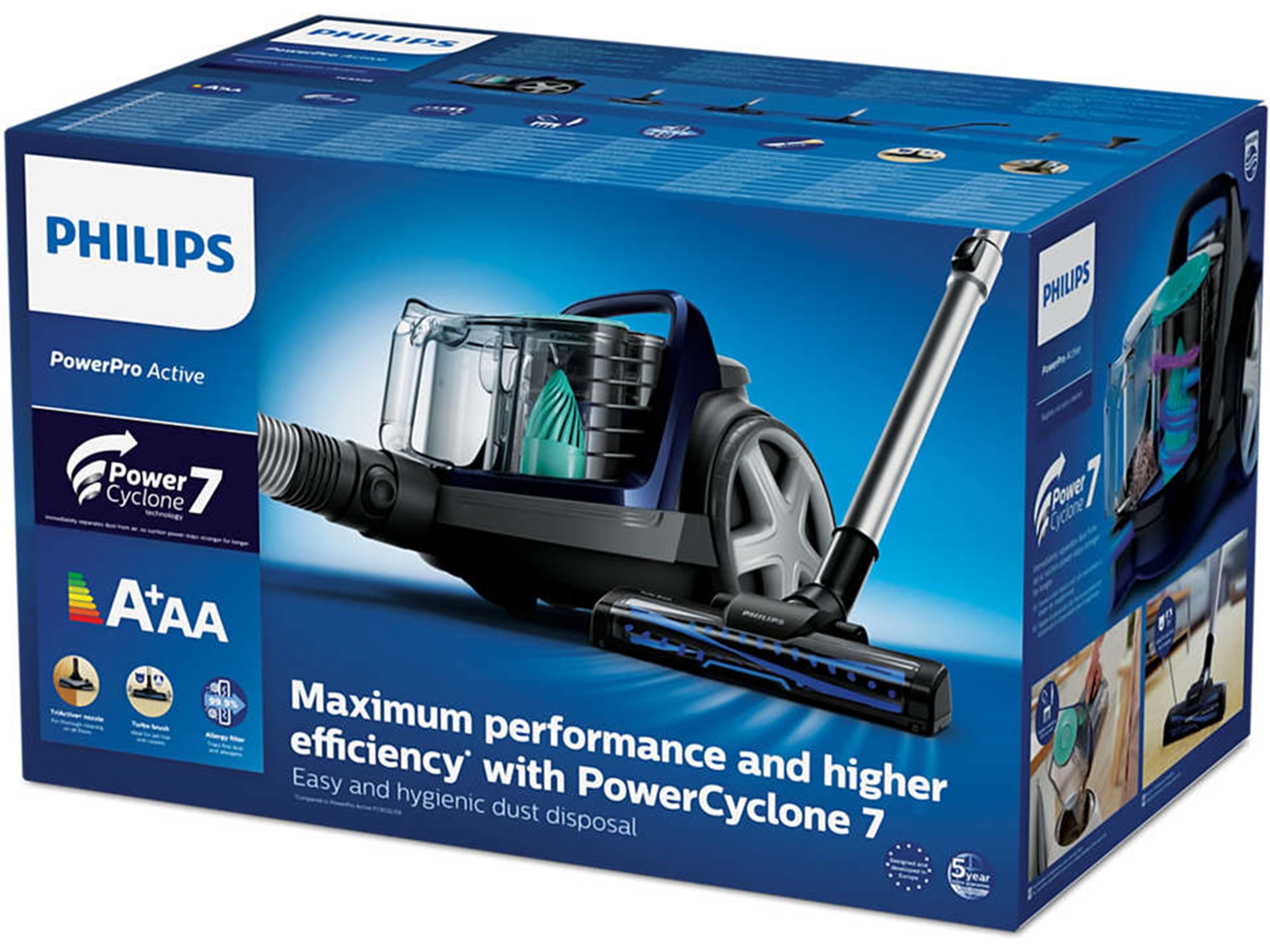 | Inkluderet tilbehør | Mundstykke til hårdt gulv, Børstepåsætning, TriActive+ dyse, Møbelmundstykke, Redskab til fuger, Teleskopisk rør, Turbo børste |