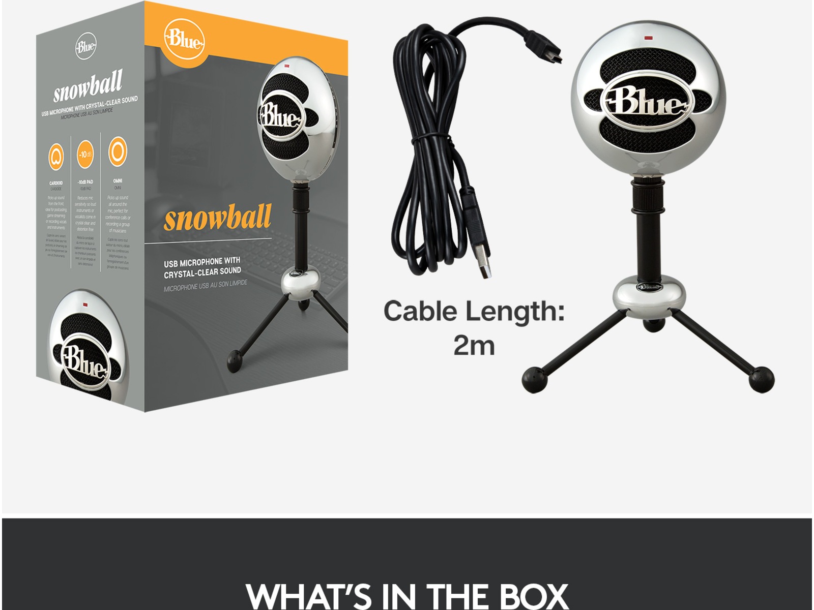 Ønsker du at få lyd i studiokvalitet hurtigt og nemt? Sådan. Snowball-familiens fremragende lydkvalitet og nem betjening gør dem til USB-mikrofoner i industristandard til podcasting og desktop-optagelse. Med Snowball og Snowball iCE kan du optage og streame forbløffende detaljeret lyd, så snart du pakker den ud og tilslutter den til din Mac eller PC. Det er lige så nemt som at rulle en snebold, og du behøver ikke at bruge fjollede vanter for at betjene den..