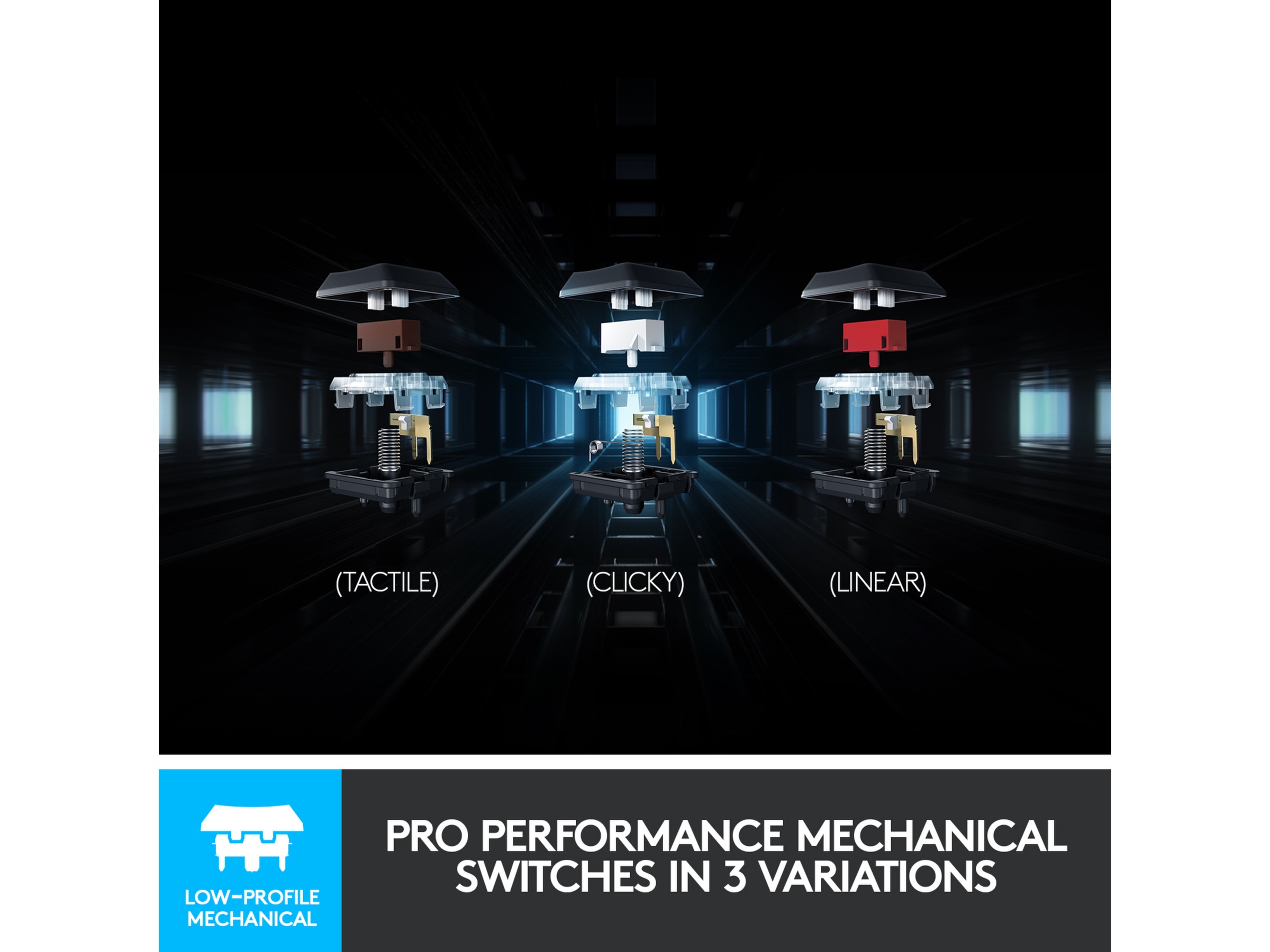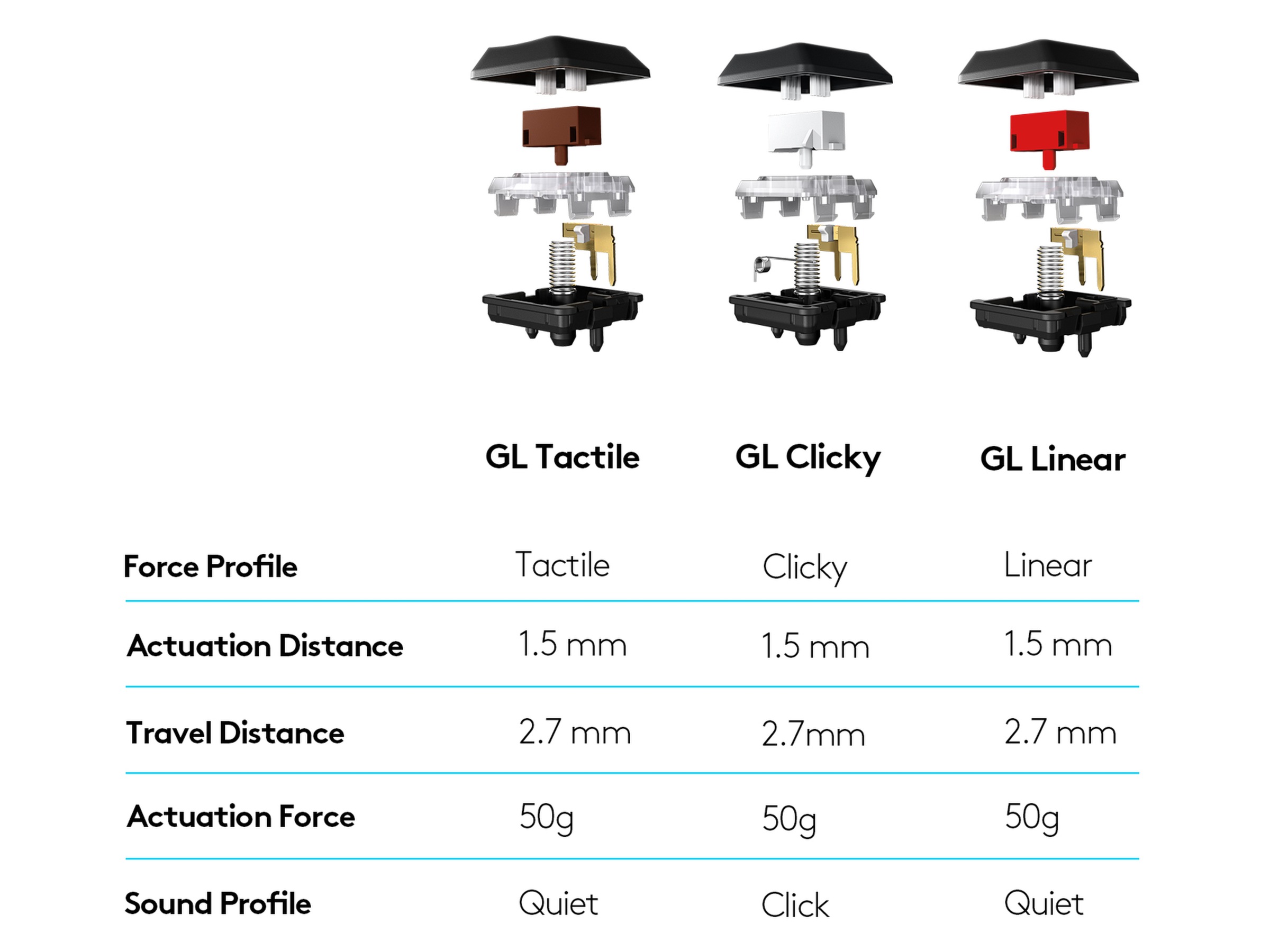 Nye højtydende spilletaster giver hastighed, nøjagtighed og den samme ydeevne som med en mekanisk tast, men i den halve højde. GL-tasterne giver en perfekt afmålt, mærkbar modstand under aktiveringen. Leveres i tre muligheder: GL Tactile, GL Linear eller GL Clicky.