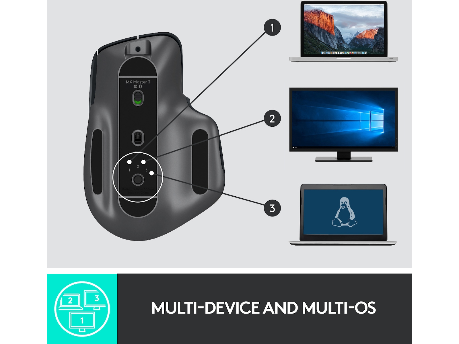 Du kan slutte musen til op til tre enheder via Bluetooth® eller den medfølgende USB-modtager der understøtter Windows, Mac og Linux.