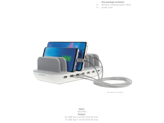 Oplad op til syv enheder samtidig med kun én oplader. 4smarts Office-ladestation med 60W udgangseffekt er ideel til ethvert kontor og et stort antal af de energikrævende enheder.