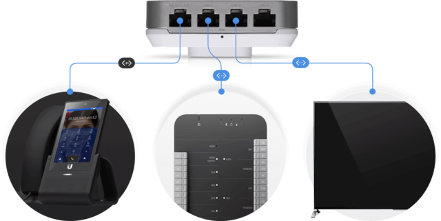 Fire porte er tilgængelige til bridging - hvoraf den ene tilbyder PoE-gennemløb, når AP drives af en 802.3at PoE + -switch.