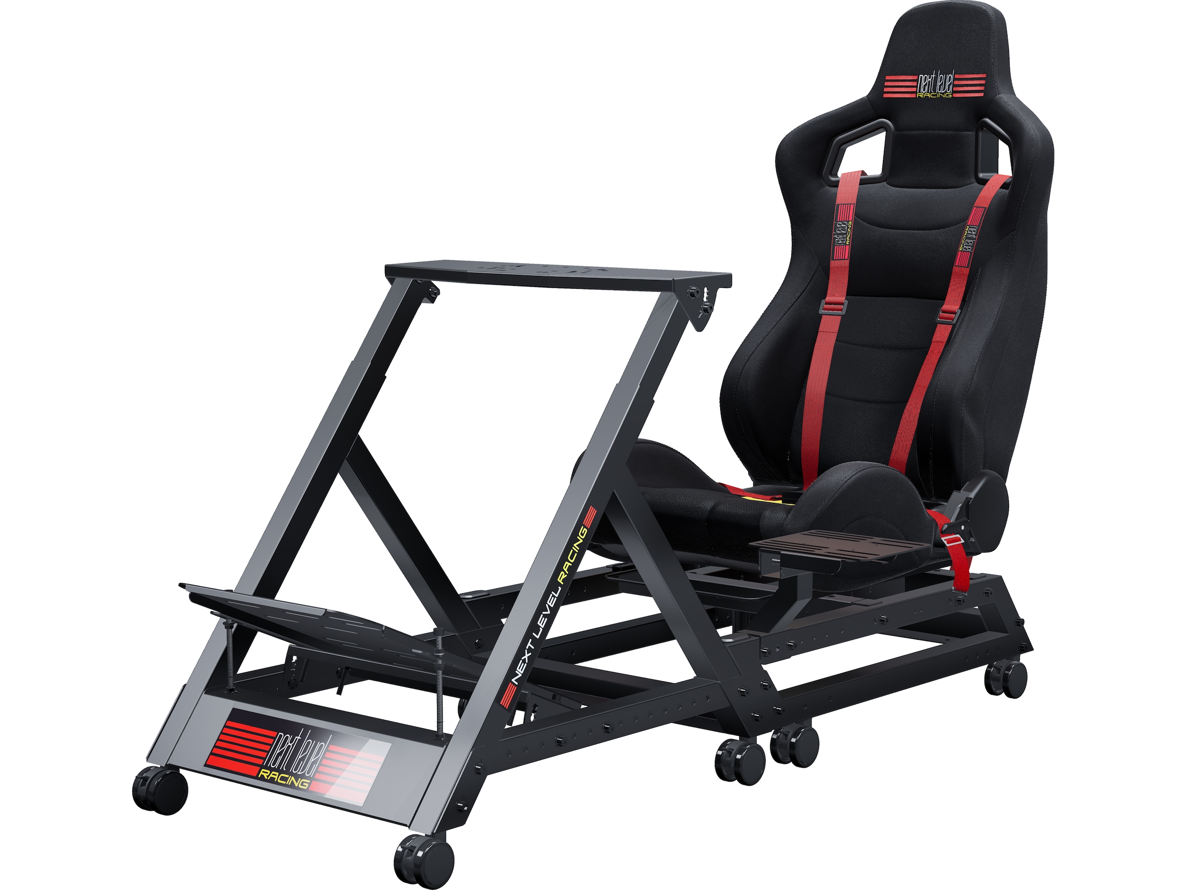 GTtrack har alle funktioner inkluderet til seriøs sim-racing som 4-punkts racersele, gearskifter og håndbremseadapter, adapter til Buttkicker® Gamer 2, højdejusterbare gummifødder til cockpiten og det nye Next Level Racing® låsbare rat, der giver dig mulighed at flytte dit cockpit med lethed og låse hjulene for seriøs racing
