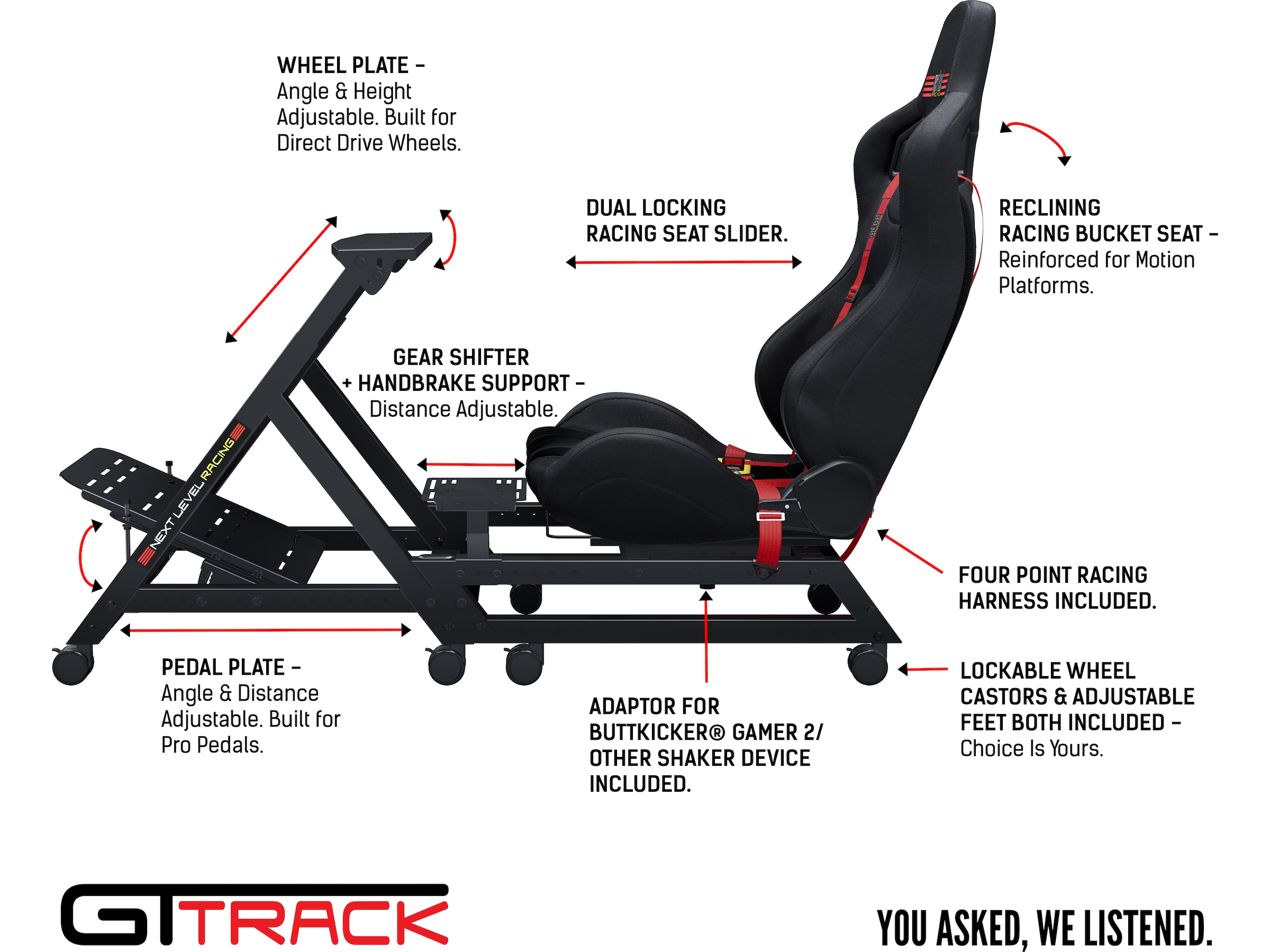 Next Level Racing® GTtrack, sagde du.. Vi lyttede. Hver funktion, der er nødvendig til seriøs sim-racing.