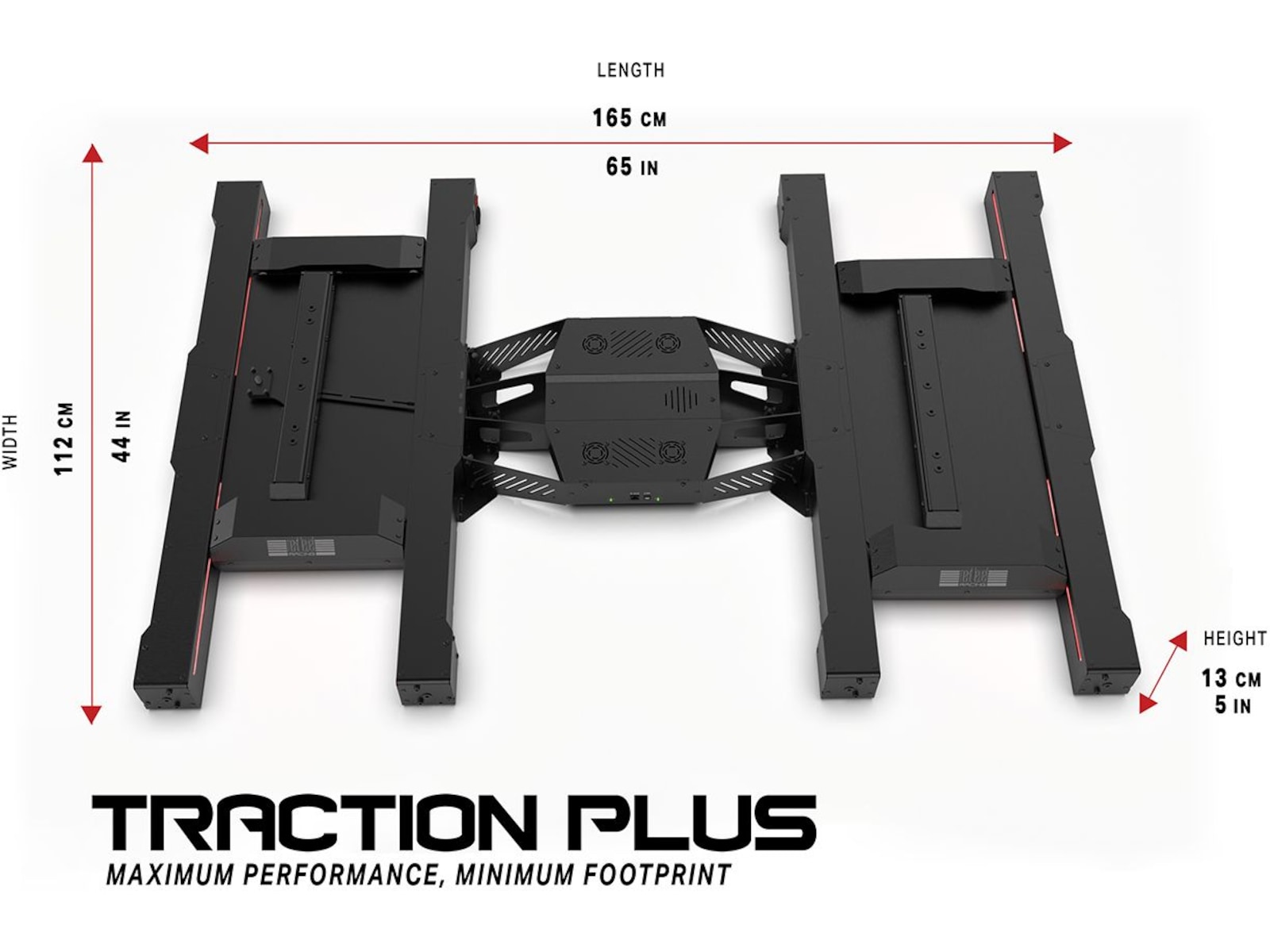 Traction Plus blev designet og udviklet i samarbejde med et bevægelsesteknik-team i verdensklasse for at levere en uovertruffen bevægelsesoplevelse. For at opnå den ultimative realisme og præcision har dette krævet helt unik teknologi og teknik med et produkt designet fra grunden over 4 år, der indeholder over 2000 komponenter. Platformen er designet og udviklet udelukkende til simulering i stedet for kun at bruge kommercielle aktuatorer og tilpasning til simulering. Traction Plus er utroligt meget mere end bare et baghjulstræk-tabssystem og er designet til at blive kombineret med V3-bevægelsesplatformen for at give en banebrydende bevægelsessimulatoroplevelse.