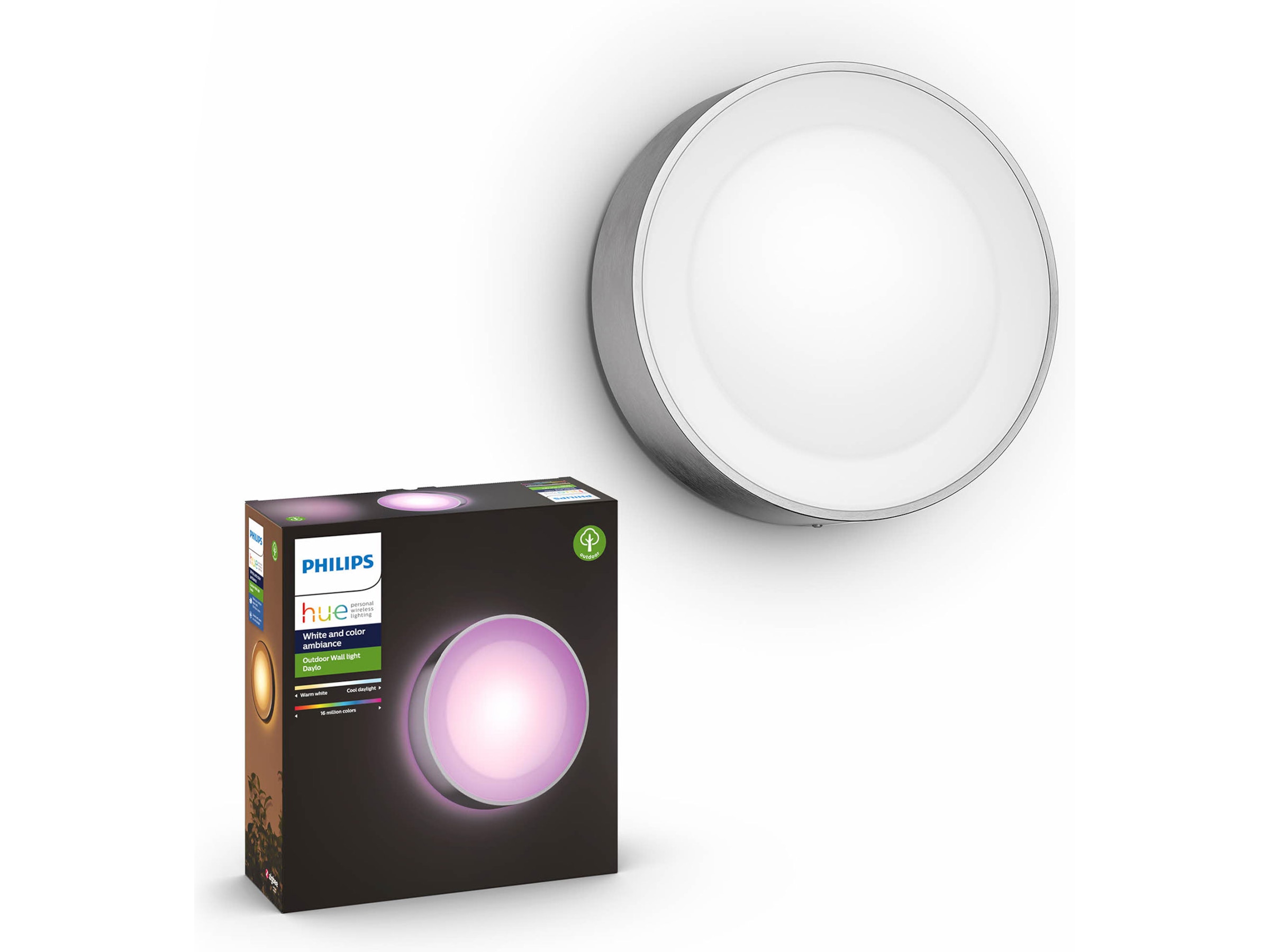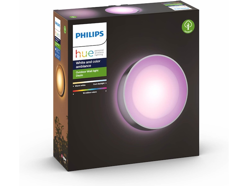 Philips Hue Daylo er en rund udendørs væglampe, der med sit moderne og alsidige udtryk passer ind i ethvert hjem.