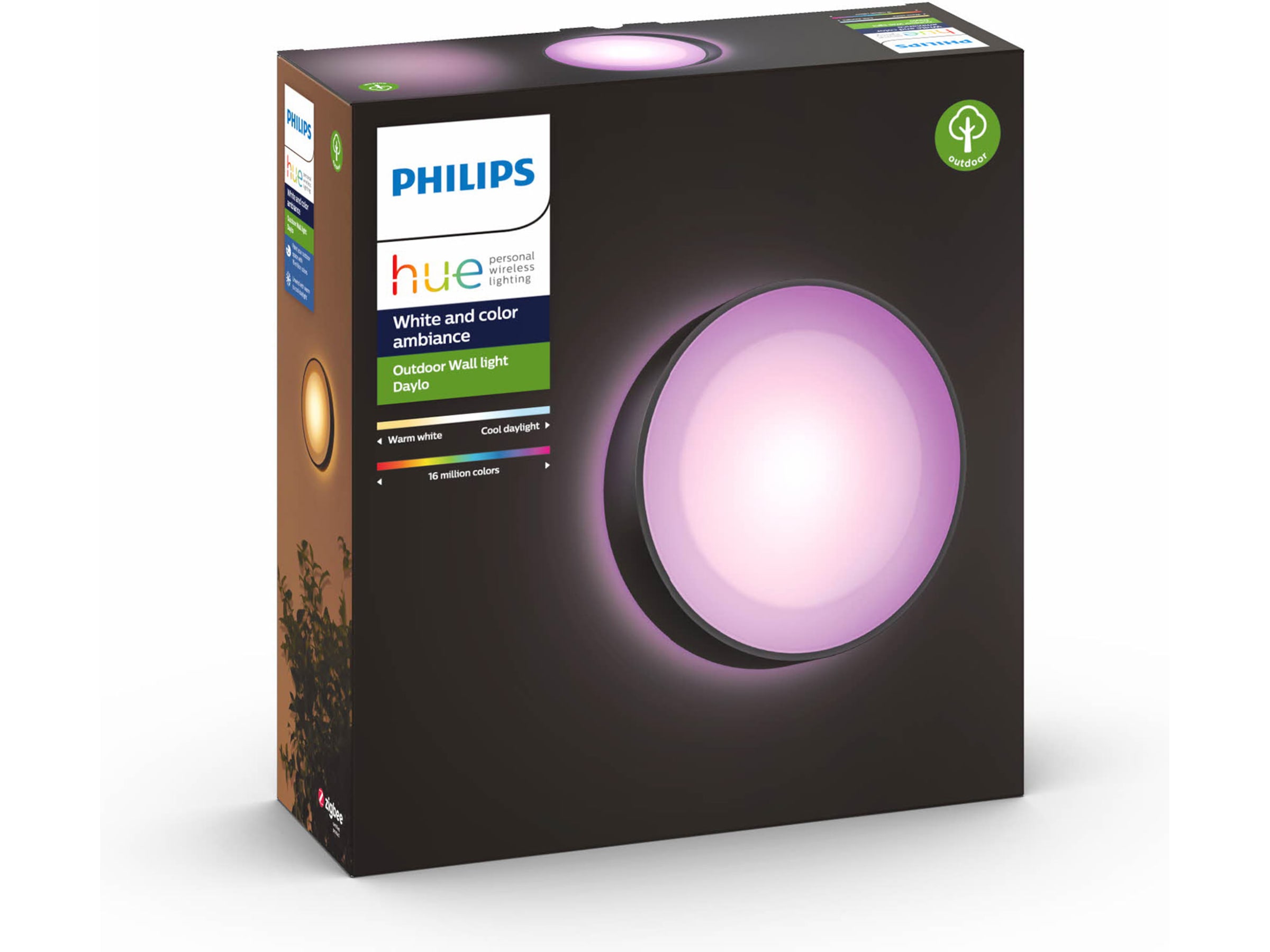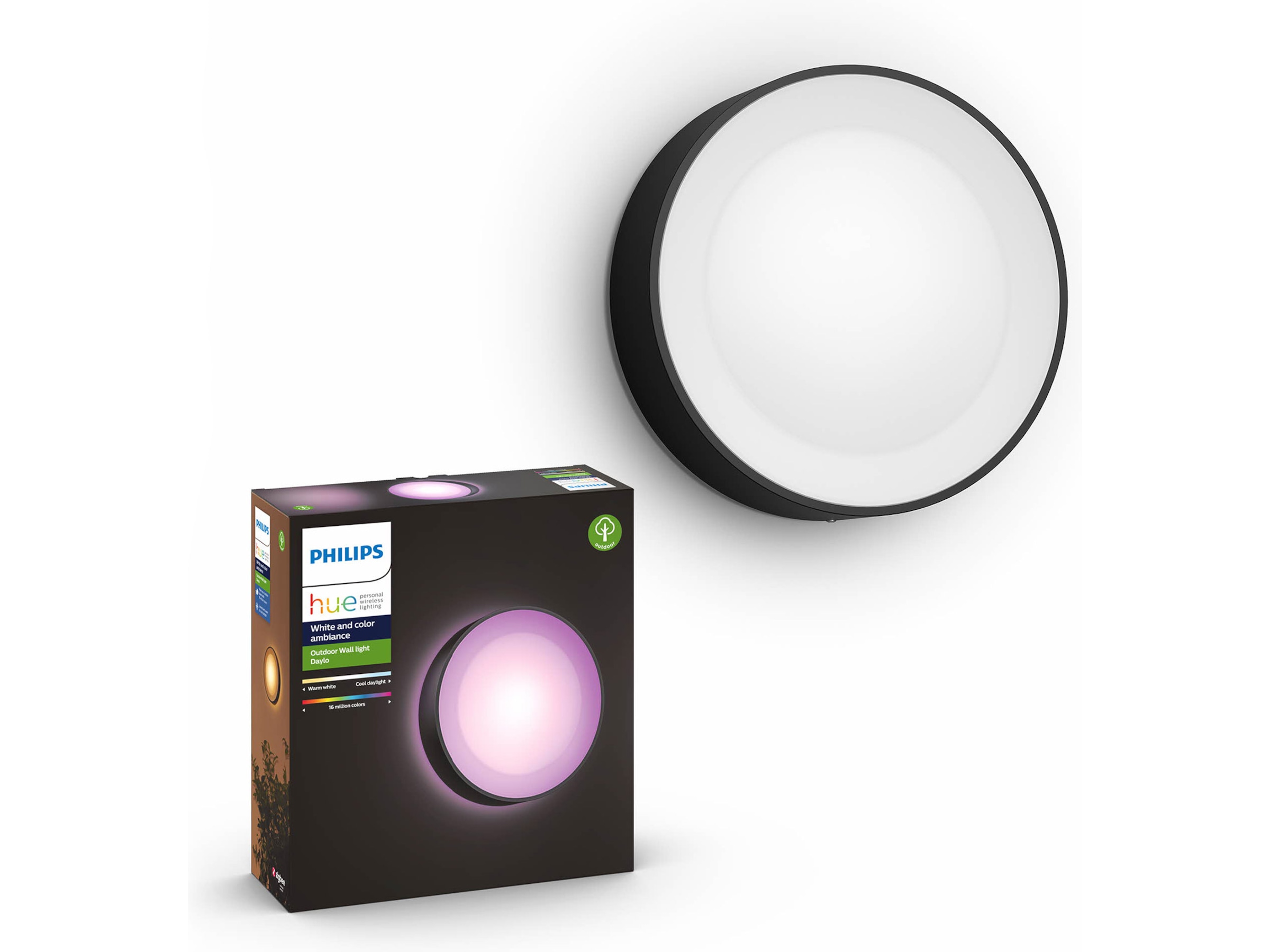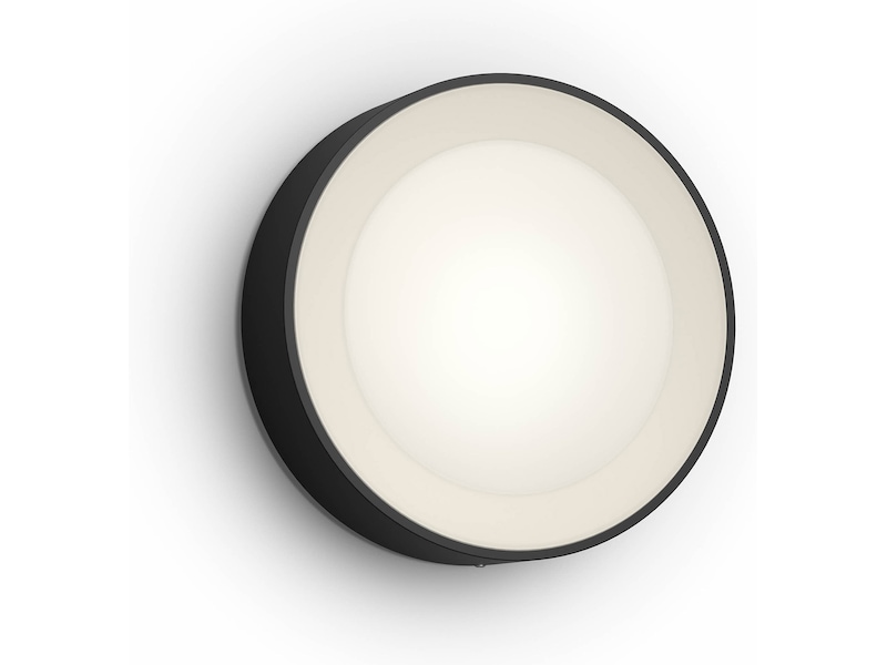 Philips Hue Daylo er en rund udendørs væglampe, der med sit moderne og alsidige udtryk passer ind i ethvert hjem.