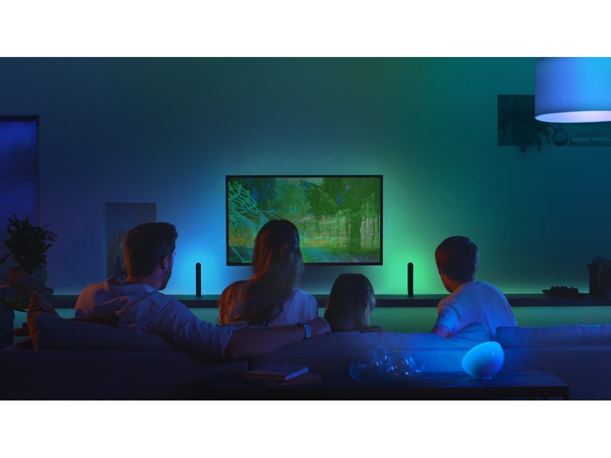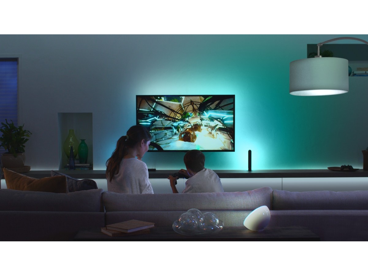 Oplev, hvordan hele rummet omkring dig inddrages og udvider din underholdningsoplevelse. Du kan via Hue appen nemt indstille lysets intensitet, farver og styrke efter behov, alt efter om du lytter til musik, spiller spil eller streamer film og TV.