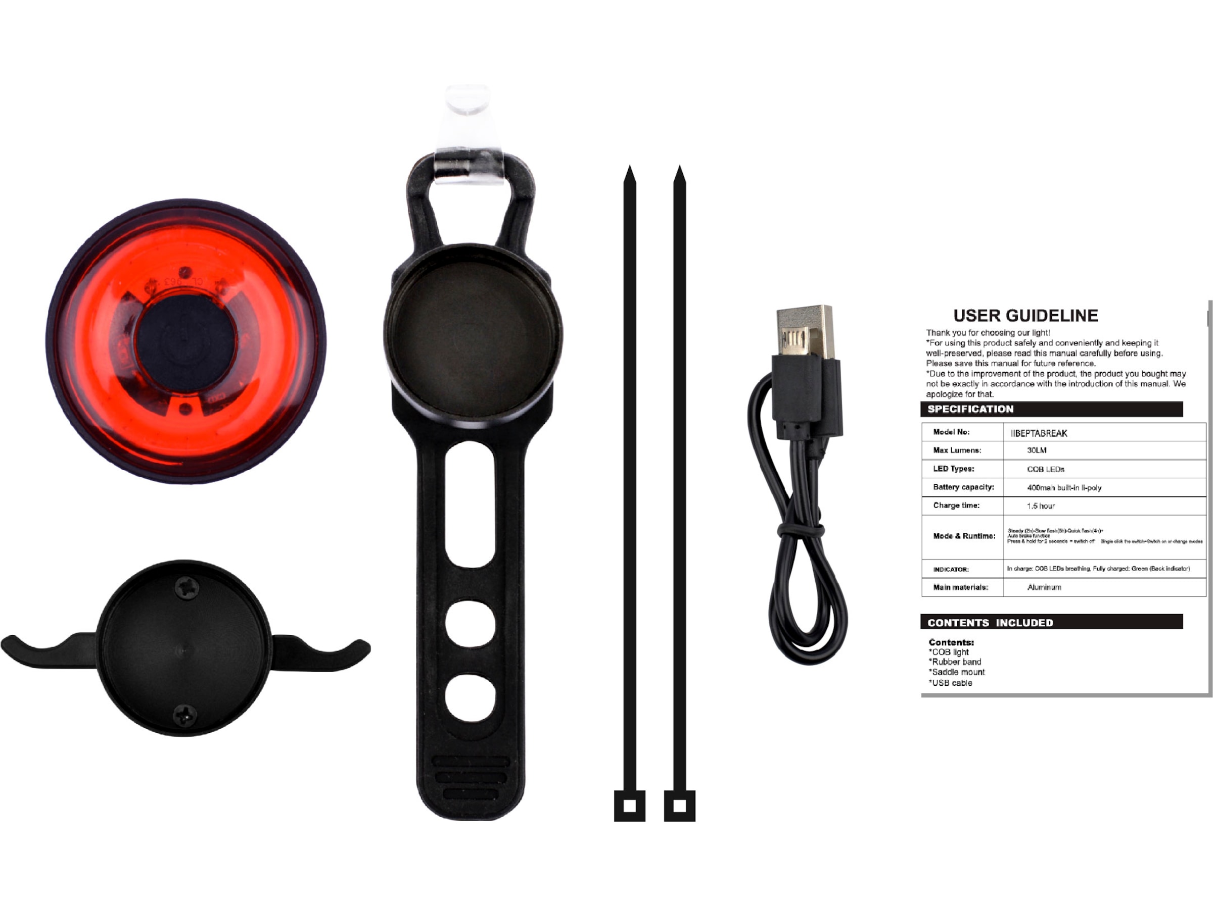 Denne lygte med rødt COB LED-lys og en lysstyrke på 30 lumen giver god synlighed bagfra. Vælg mellem 4 forskellige lystilstande. 3 tilstande til fast lys og 1 tilstand til blink. Fuld styrke giver lys i ca. 2 timer og hurtigblink giver lys i 4 timer.