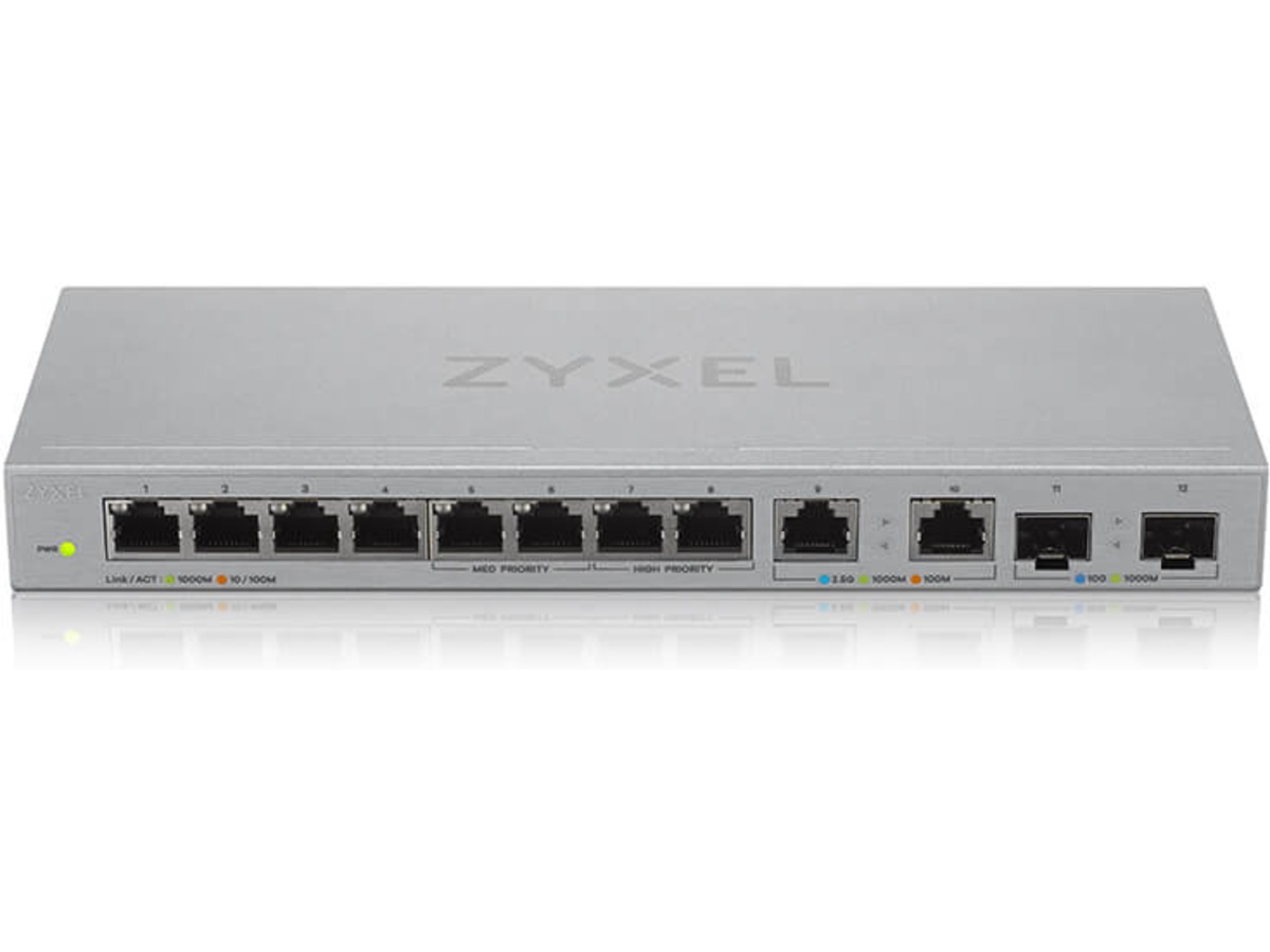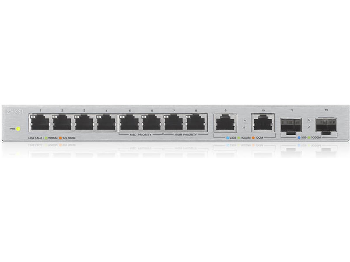 Zyxel XGS1010-12 kommer med otte gigabit Ethernet-porte, to 2,5 Gigabit-porte og to 10 Gigabit SFP+ uplink-porte. Lever dine data hurtigt til dine klientenheder fra din NAS eller andre vigtige netværk med 10 Gigabit SFP+. Tilslut de nyeste 802.11ax-adgangspunkter til 2,5 Gigabit-portene for ægte maksimal trådløs hastighedslevering. Den er designet specifikt til kunder, der har brug for en overkommelig 10GbE-netværksforbindelse på tværs af en række blandede miljøer fra hjemmet til kontoret.