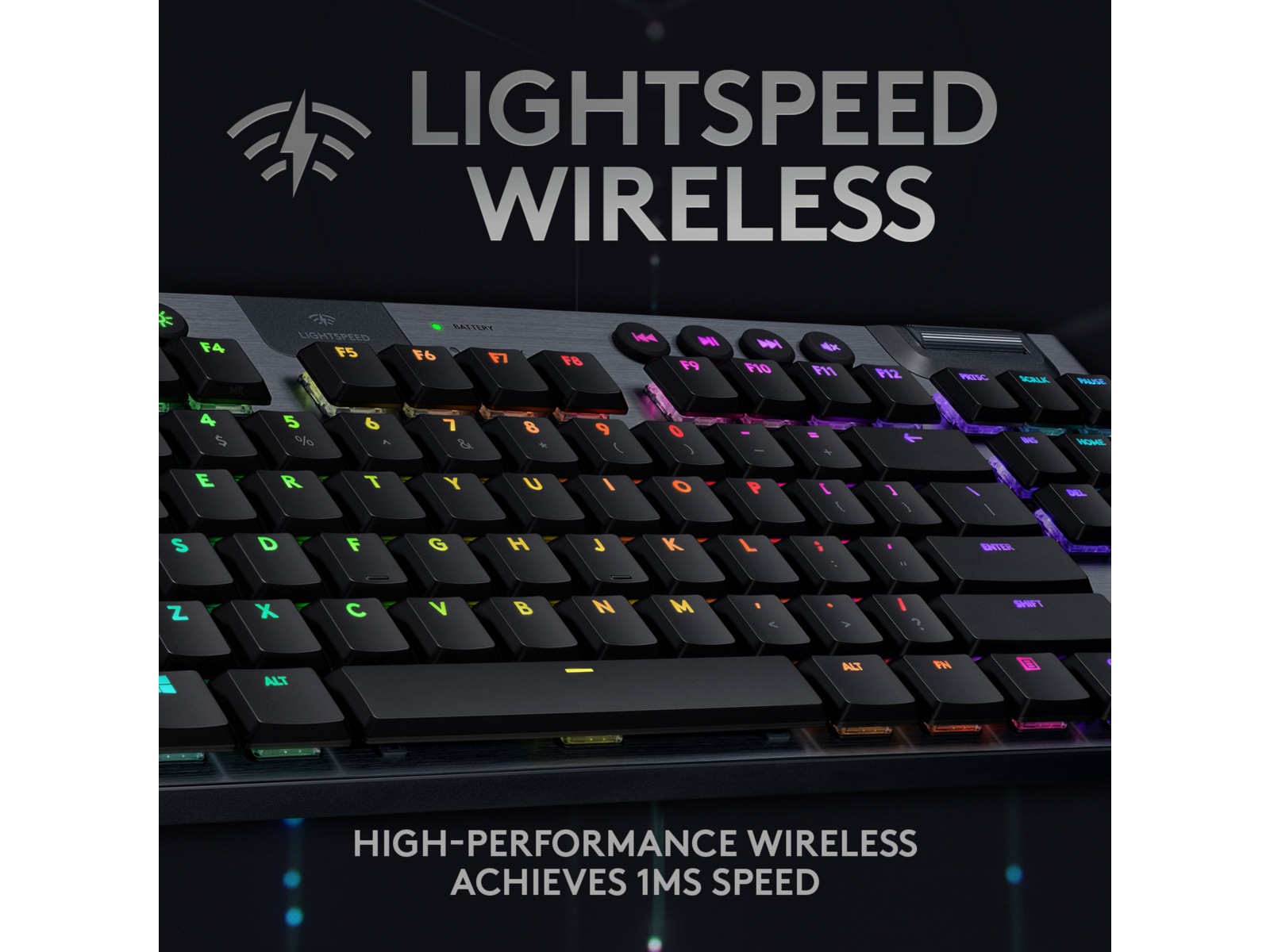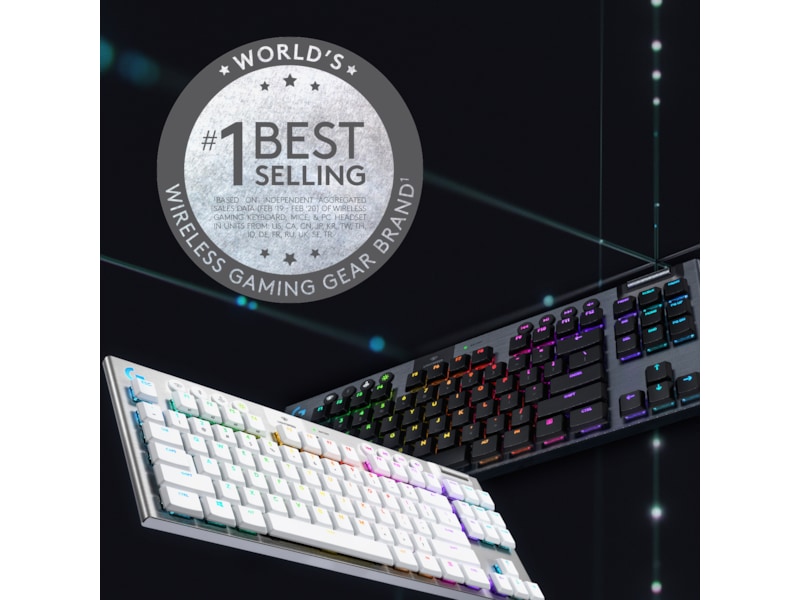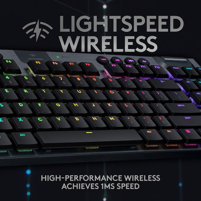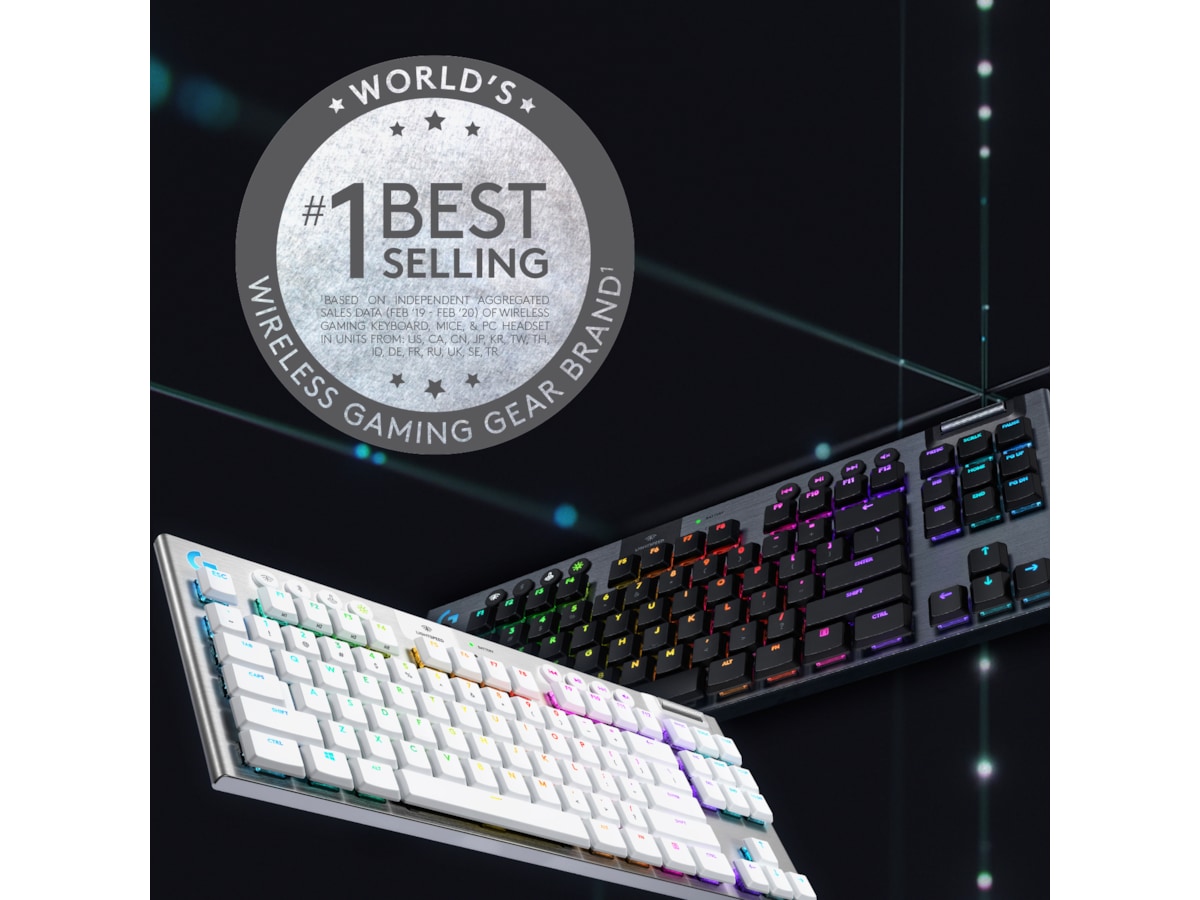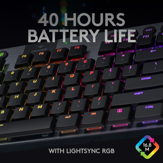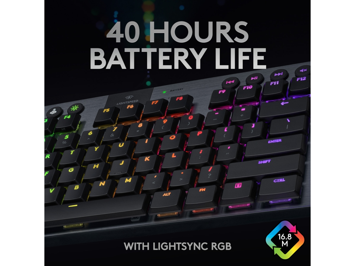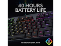 med 1 ms responstid og mulighed for tre typer GL-taster med lav profil. Op til 40 timers nonstop gaming på en enkelt opladning. Den avancerede RGB- belysning med LIGHTSYNC teknologi kan konfigureres for hver enkelt tast og kan synkroniseres med indholdet på skærmen.