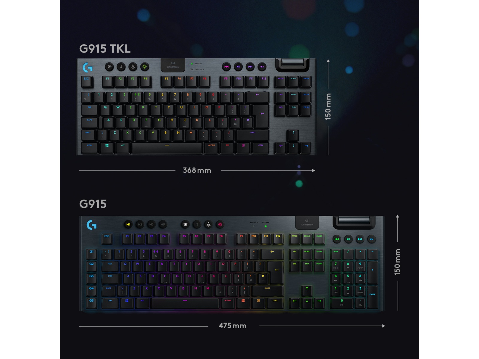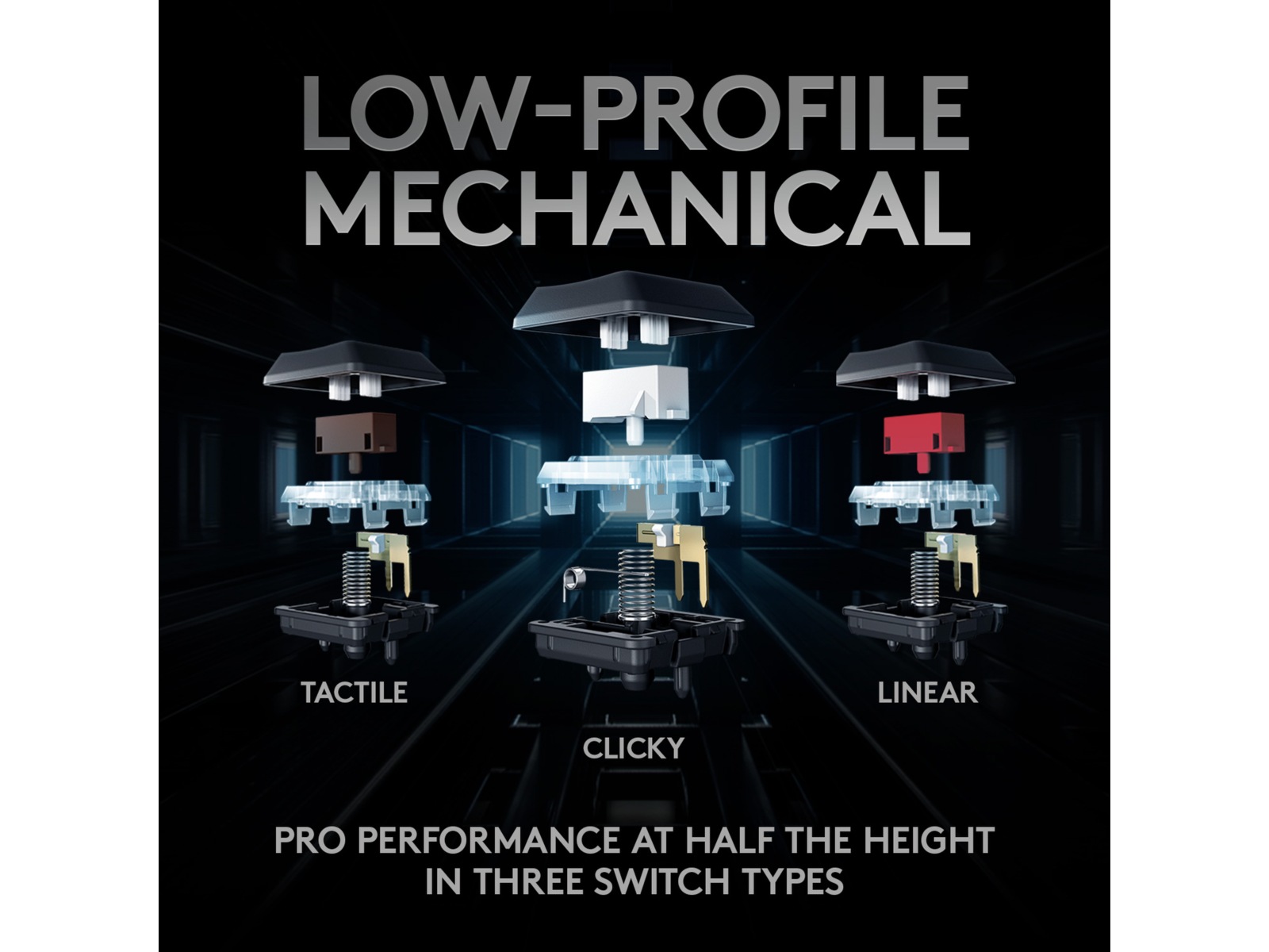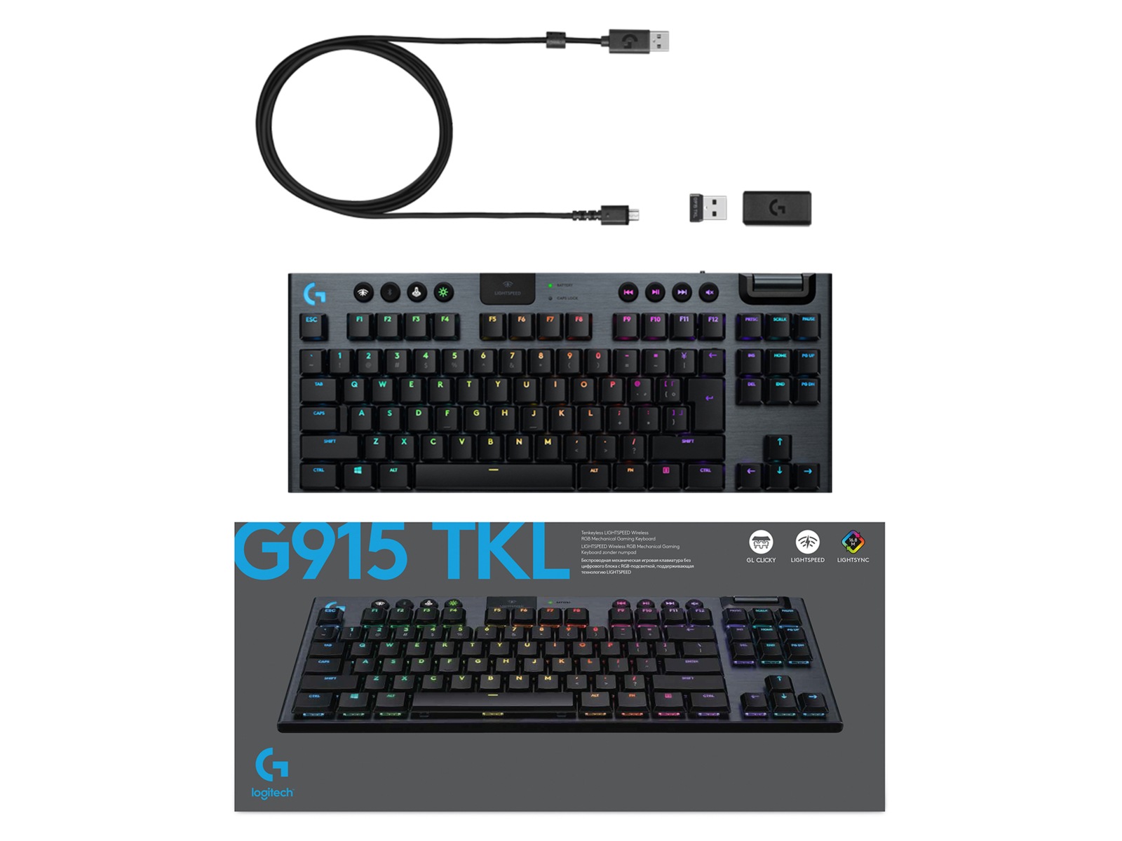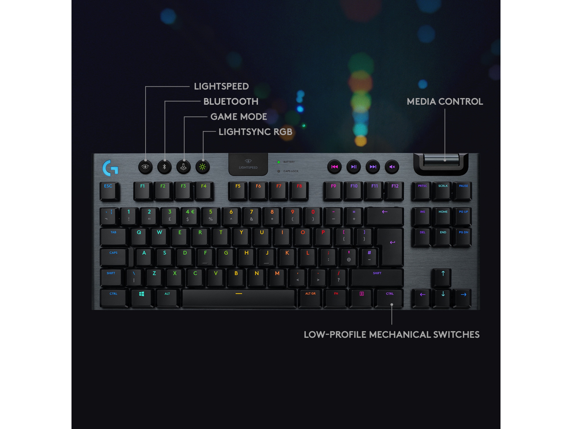 med 1 ms responstid og mulighed for tre typer GL-taster med lav profil. Op til 40 timers nonstop gaming på en enkelt opladning. Den avancerede RGB- belysning med LIGHTSYNC teknologi kan konfigureres for hver enkelt tast og kan synkroniseres med indholdet på skærmen.