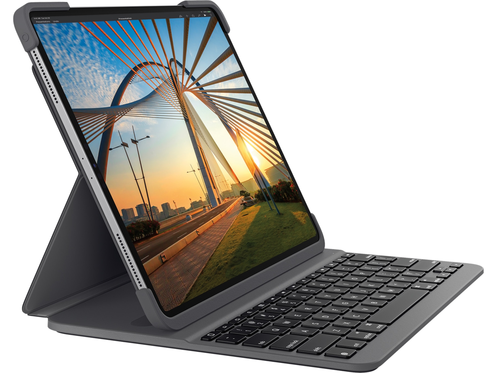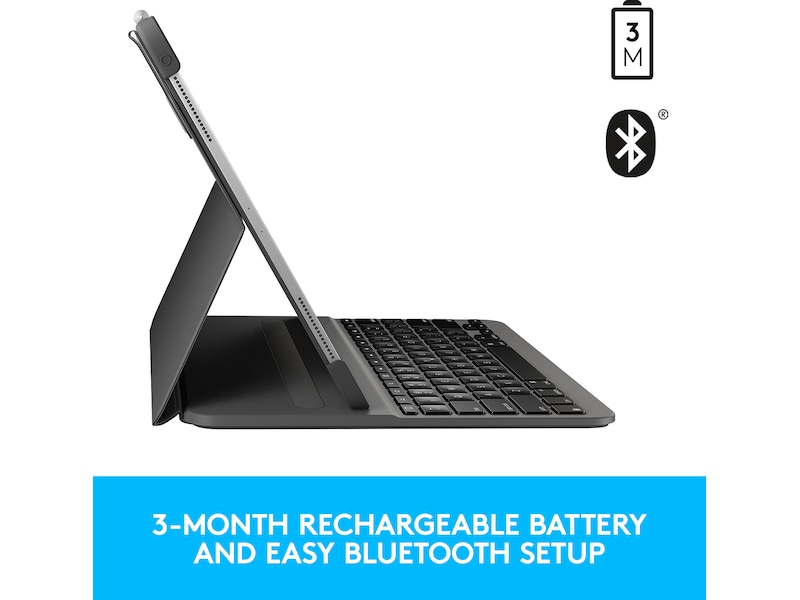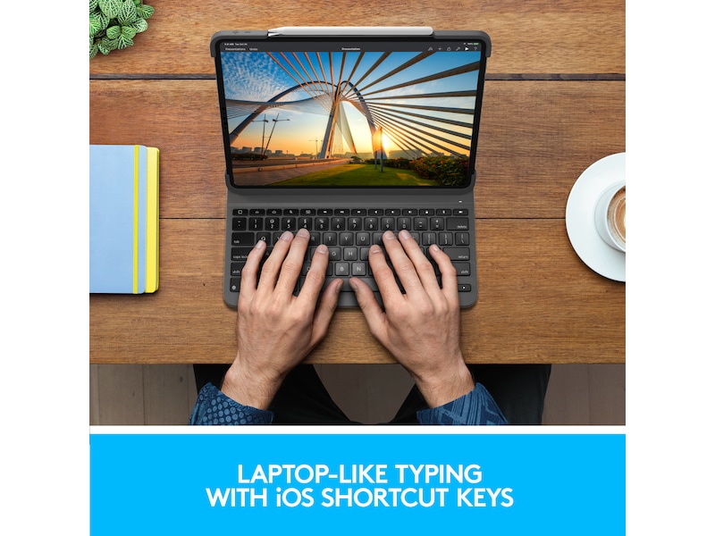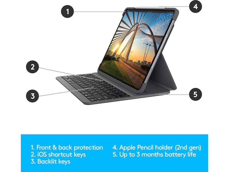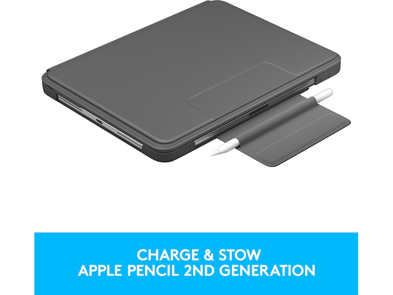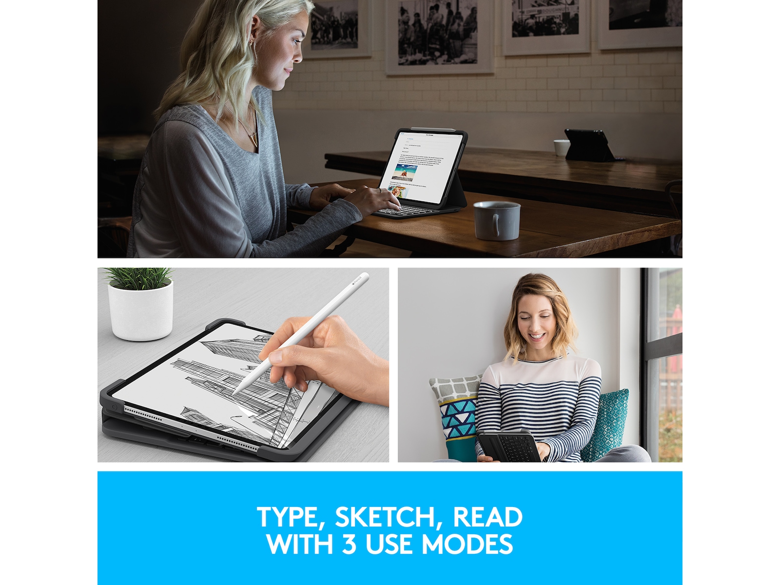 Skriv som på en bærbar computer på iPad Pro med Slim Folio Pro. Tre forskellige anvendelsesformer sikrer, at du altid kan arbejde med maksimal effektivitet, uanset hvor du er - ved et cafebord, skrivebord eller endda i skødet. Dette lette alt-i-et etui beskytter både forsiden og bagsiden af din enhed. Det har endda en praktisk holder, hvor du kan oplade og opbevare Apple Pencil (2. gen).