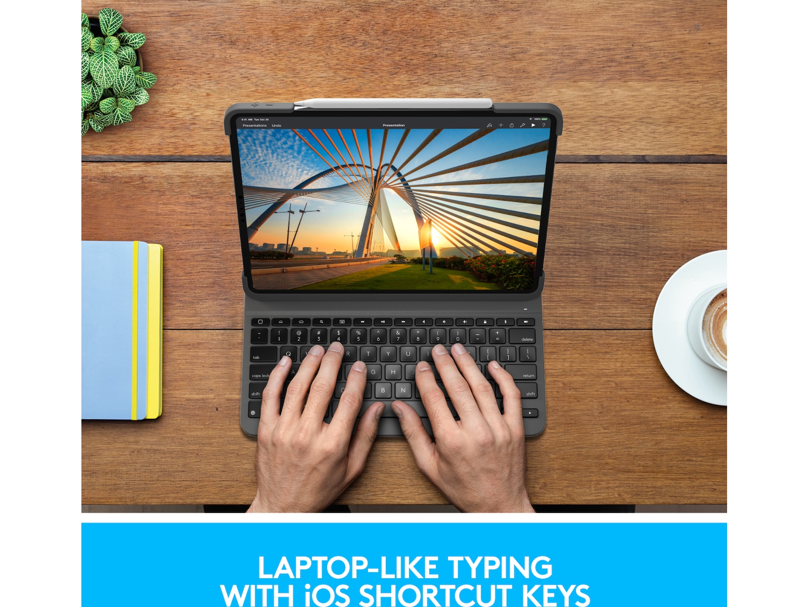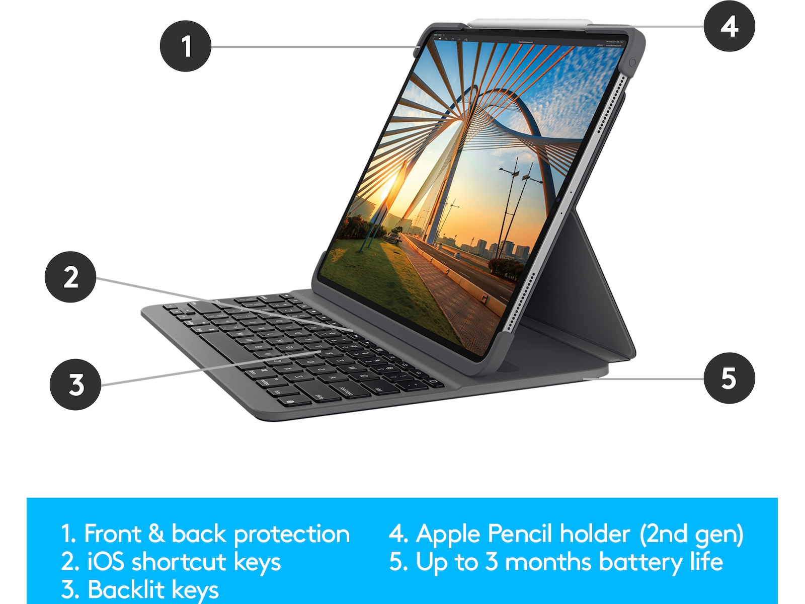 Skriv som på en bærbar computer på iPad Pro med Slim Folio Pro. Tre forskellige anvendelsesformer sikrer, at du altid kan arbejde med maksimal effektivitet, uanset hvor du er - ved et cafebord, skrivebord eller endda i skødet. Dette lette alt-i-et etui beskytter både forsiden og bagsiden af din enhed. Det har endda en praktisk holder, hvor du kan oplade og opbevare Apple Pencil (2. gen).