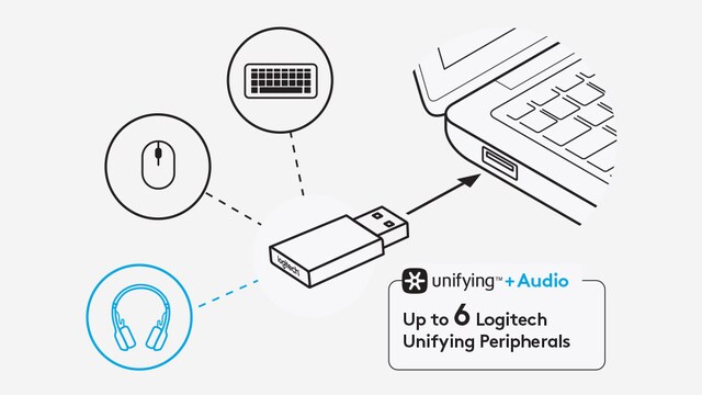 Du kan bruge Zone Wireless Plus-headsettet med op til seks andre trådløse Logitech Unifying™-enheder ved at benytte den samme USB-modtager. Modtageren tilsluttes en USB-A-port i computeren og giver en trådløs rækkevidde på op til 10 meter til mus og tastatur og op til 30 meter til headset. Den lille modtager kan bare blive siddende i USB-porten – så ved du altid hvor du har den. Det er ikke længere nødvendigt at skulle vælge mellem headsettet, musen eller andre eksterne enheder – nu kan du bruge dem alle på en gang.