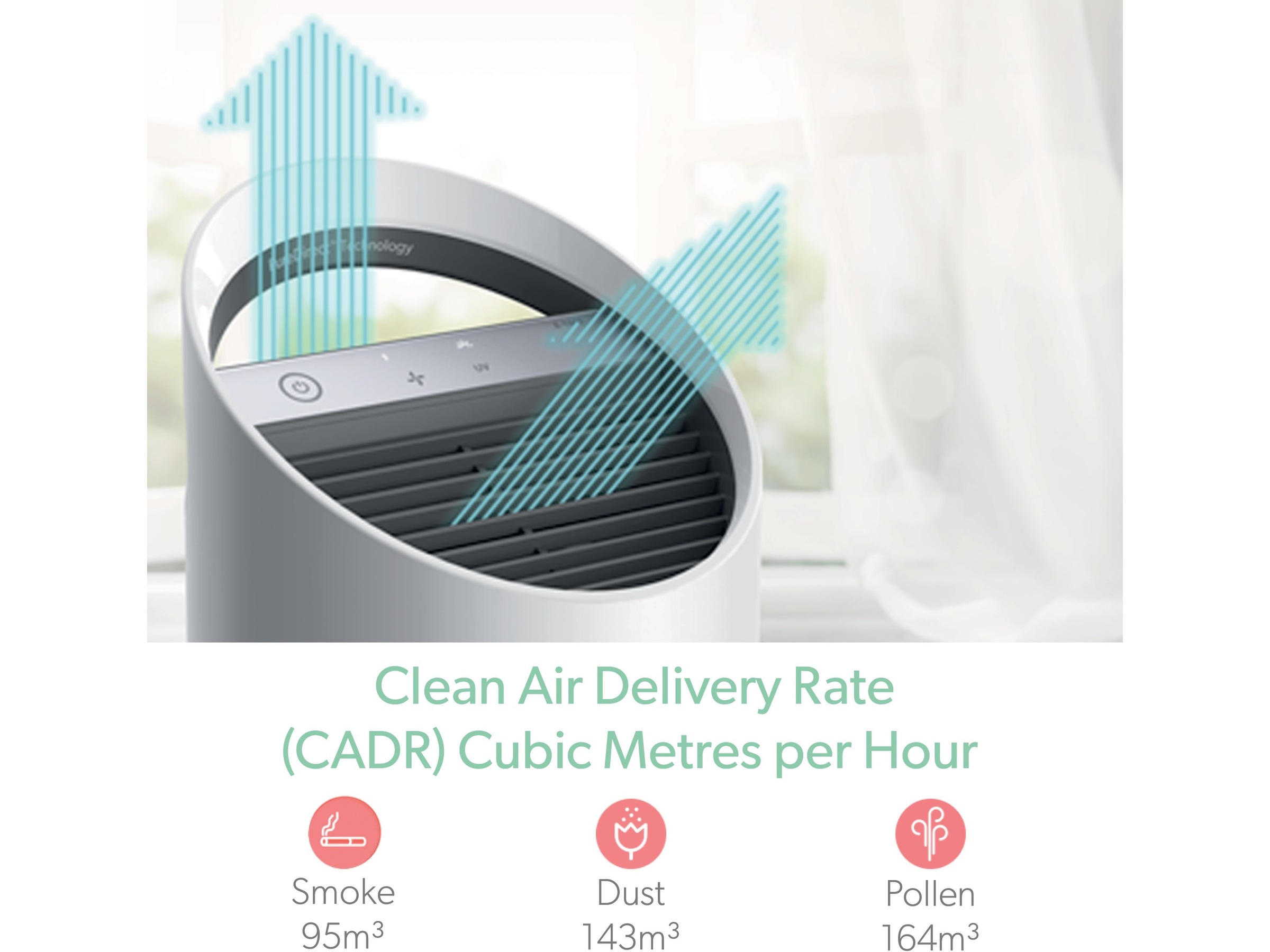 Ideel til rum op til 23m2 med en Clean Air Delivery Rate (CADR) på 164 m3/timen for pollen, 143 m3/timen for støv og 95 m3/timen for røg.