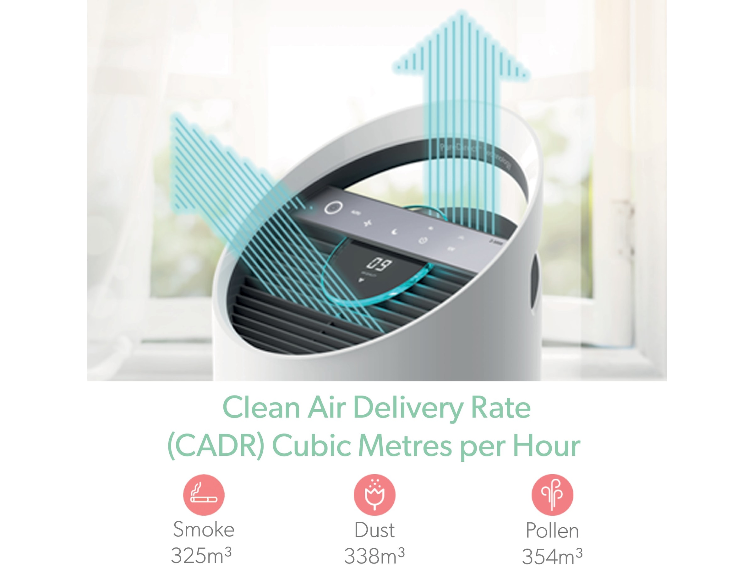 Ideel til rum op til E114 med en Clean Air Delivery Rate (CADR) på 354 m3/timen for pollen, 338 m3/timen for støv og 325 m3/timen for røg