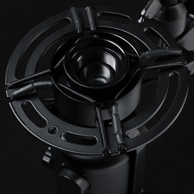 Med dens stødabsorberende konstruktion og dens gummibånd forhindrer et plade-stødbeslag, at vibrationer overføres fra det omgivende miljø til mikrofonen, så din stemme forbliver høj og tydelig.