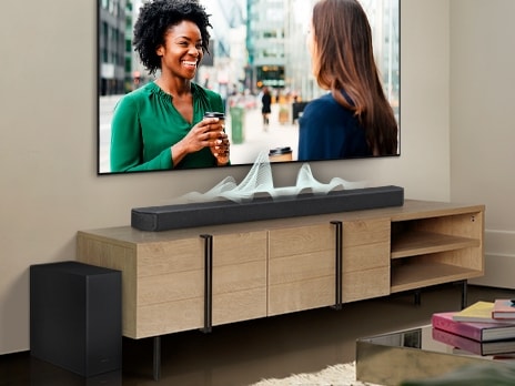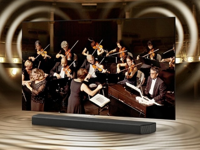 Soundbar Q900T synkroniseres med Samsung TV, og sammen skaber de fordybende lyd. Det kombinerer og forbedrer lyden gennem front- og sidehøjttalerne, de opadvendte højttalere og TV-højttalerne og sidehøjttalerne og giver en akustisk indlevelse på et helt nyt niveau.