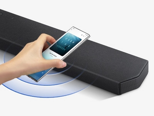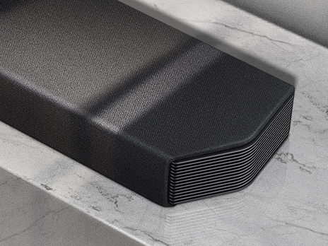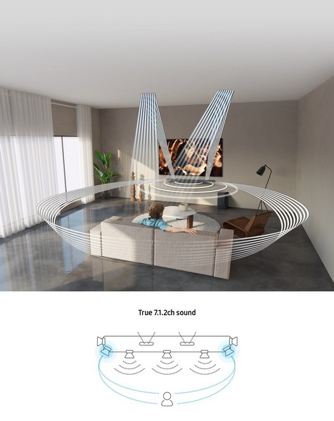Soundbar Q900T synkroniseres med Samsung TV, og sammen skaber de fordybende lyd. Det kombinerer og forbedrer lyden gennem front- og sidehøjttalerne, de opadvendte højttalere og TV-højttalerne og sidehøjttalerne og giver en akustisk indlevelse på et helt nyt niveau.