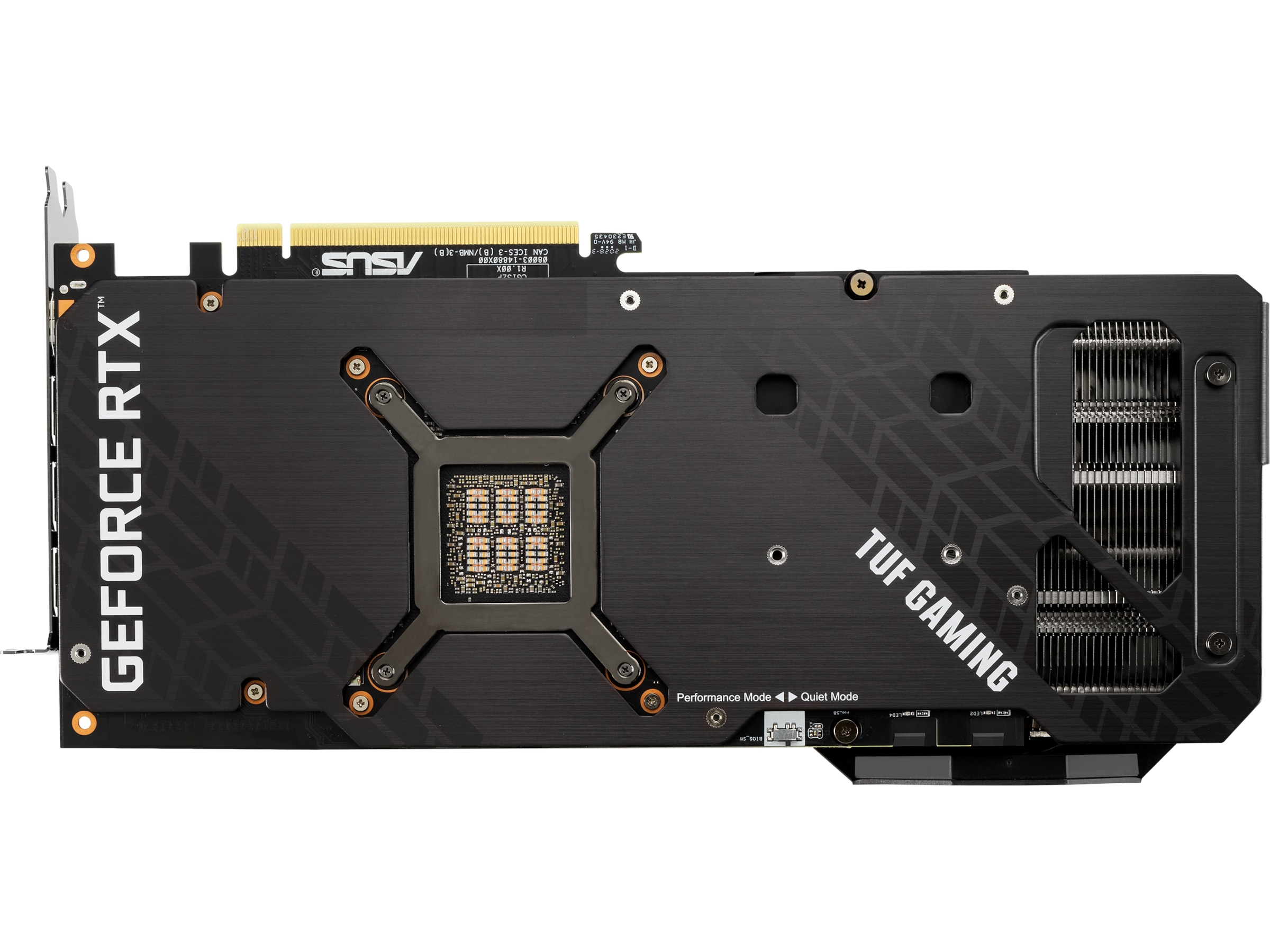 Varmesprederen trækker varmen op i varmeledninger, der fører den gennem en finnestak, der fylder det meste af kortets store fodspor på 2,7-slot. Denne generation af TUF Gaming-grafikkort har også en dedikeret køleplade til VRAM for at holde temperaturer godt under maksimale driftsspecifikationer.