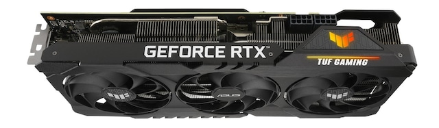 Varmesprederen trækker varmen op i varmeledninger, der fører den gennem en finnestak, der fylder det meste af kortets store fodspor på 2,7-slot. Denne generation af TUF Gaming-grafikkort har også en dedikeret køleplade til VRAM for at holde temperaturer godt under maksimale driftsspecifikationer.