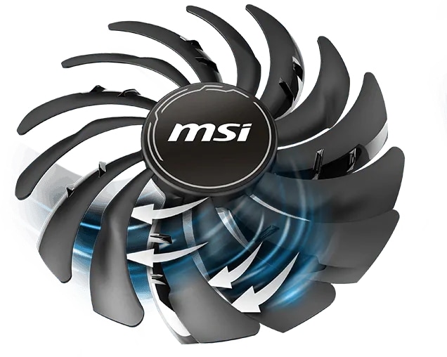 Det prisvindende MSI TORX Fan 3.0-design overholder grænserne for termisk ydeevne. Ventilatorblade skifter mellem traditionelle blade og dispersionsblade, der fokuserer og fremskynder luftstrømmen ind i kølelegemet.