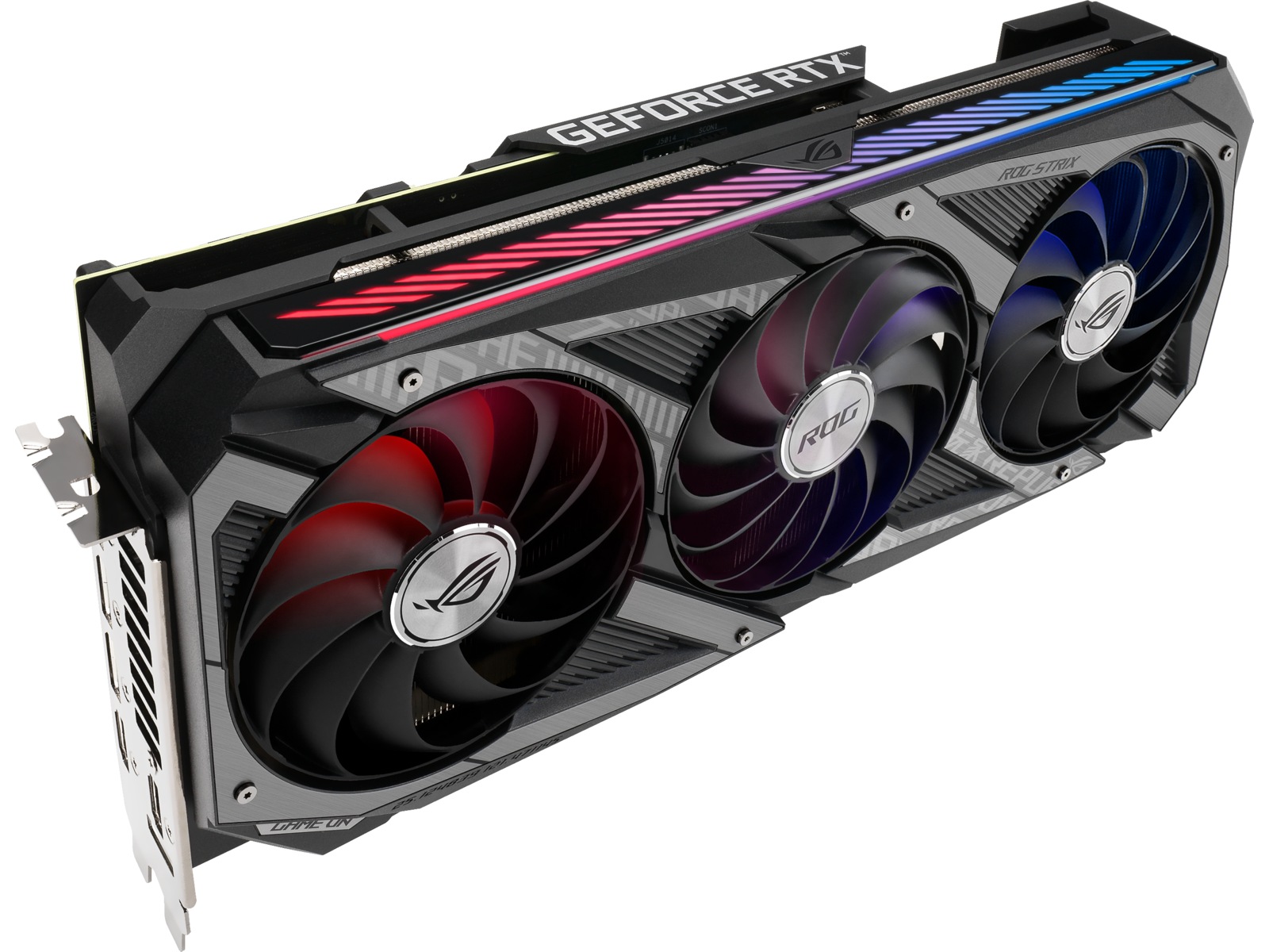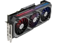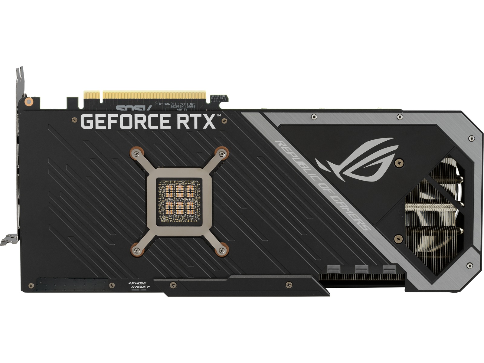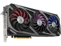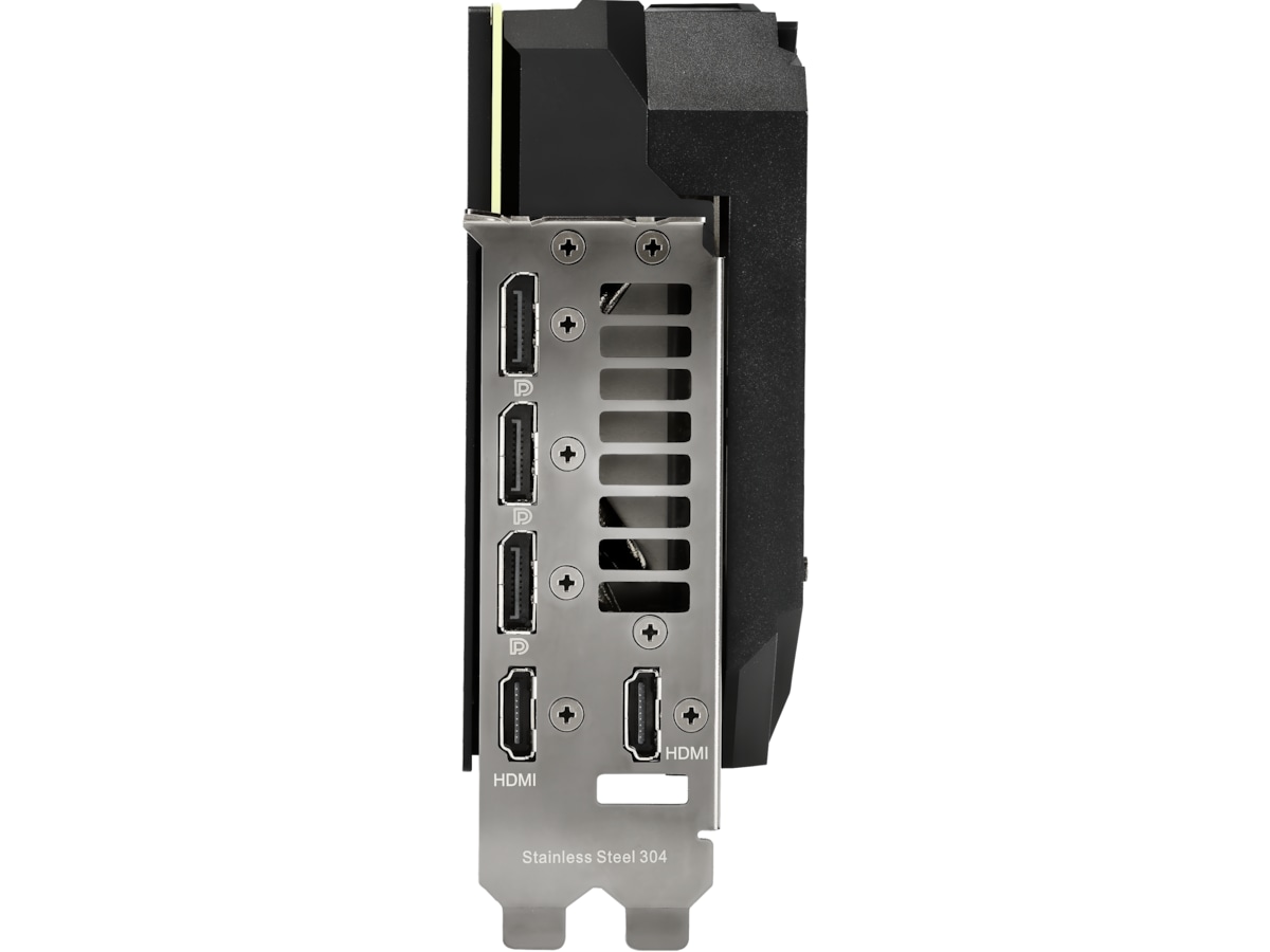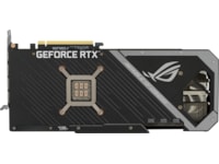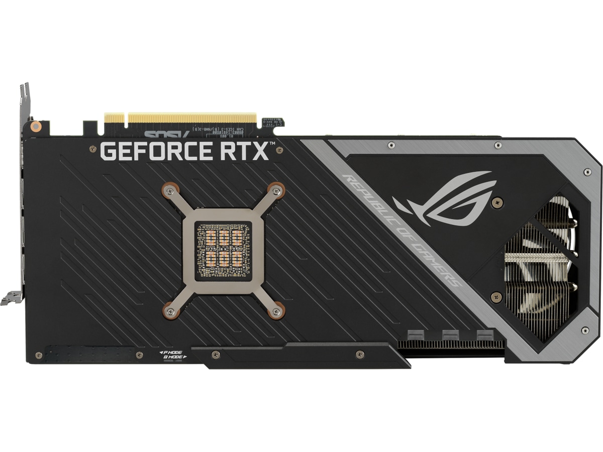 Forsiden af GPU'en har der været særlig opmærksomhed på, da det er den mest synlige del af kortet i typiske konfigurationer. Et nyt adresserbart RGB-element kan tilpasses med Armory Crate for at skabe et ensartet look sammen med andre ROG-komponenter. For at opfylde strømkravene til GeForce RTX 3080 er der tre 8-polede strømstik til stede sammen med et indbygget kredsløb, der overvåger PSU-skinnespænding. Kredsløbet er hurtigt nok til at fange transienter, der resulterer i, at skinnespændingen falder for lavt. Hvis det sker, vil en rød LED lyse for at indikere et strømforsyningsproblem. Strix's forstærkede metalramme er også synlig her og tilføjer et ægte lag af holdbarhed.
