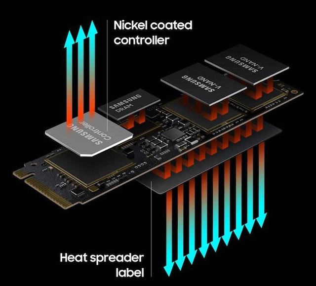 Højtydende SSD'er kræver normalt højtydende varmestyring. For at sikre stabil ydeevne er 980 PRO udstyret med en nikkelbelægning, der hjælper med at håndtere controllerens varmeniveau, og en varmefordeler, der sørger for effektiv varmestyring af NAND-chippen.