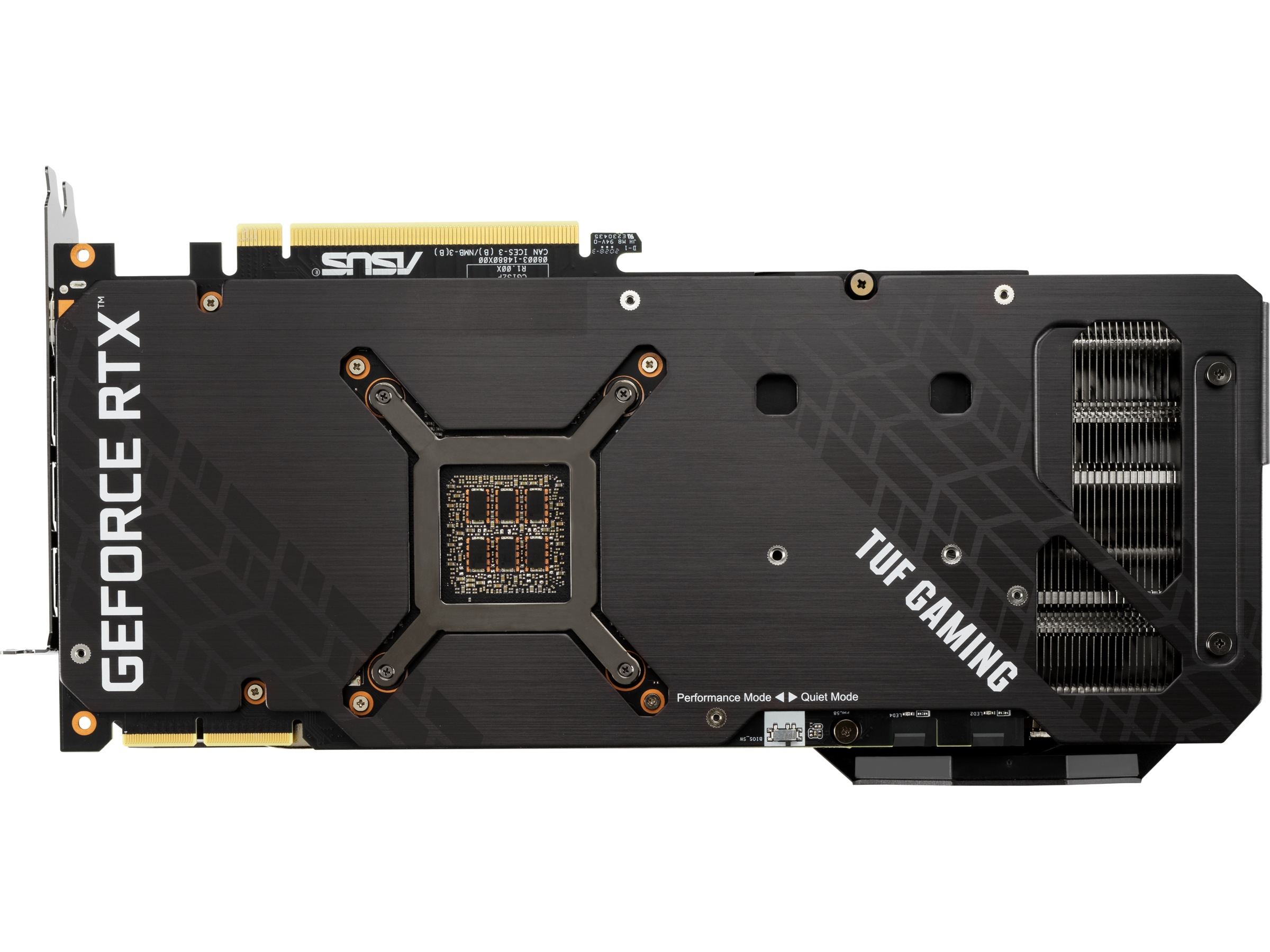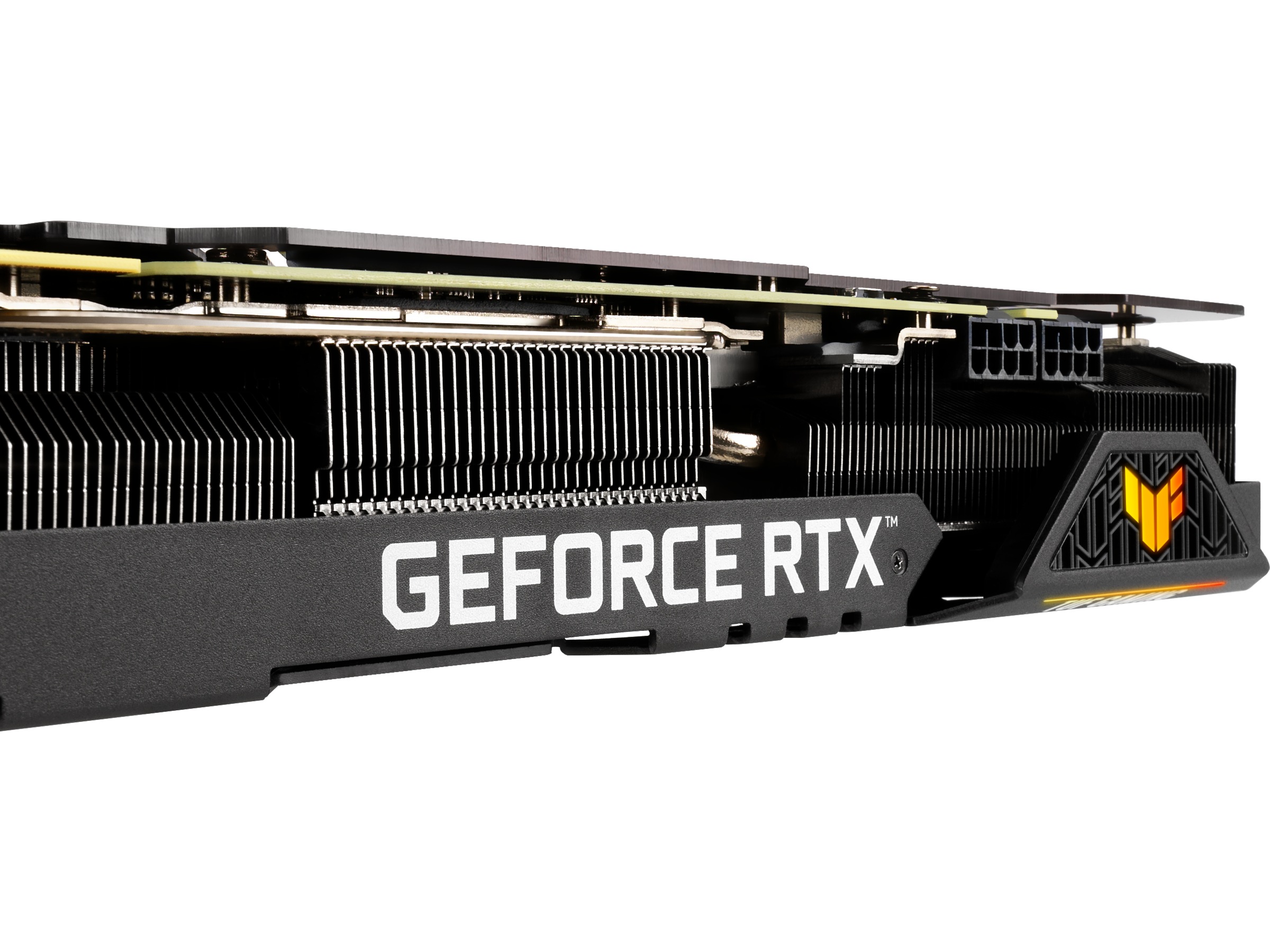 Varmesprederen trækker varmen op i varmeledninger, der fører den gennem en finnestak, der fylder det meste af kortets store fodspor på 2,7-slot. Denne generation af TUF Gaming-grafikkort har også en dedikeret køleplade til VRAM for at holde temperaturer godt under maksimale driftsspecifikationer.