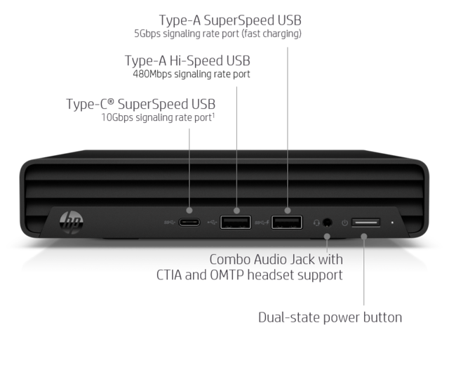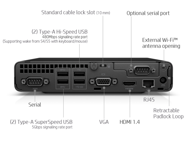 | Interface | 1 x VGA, 1 x LAN (Gigabit Ethernet), 1 x hovedtelefoner/mikrofon (1 foran), 4 x USB 3.1 Gen 1 (2 front, 2 bag), 1 x HDMI, 2 x USB 2.0, 1 x seriel |
