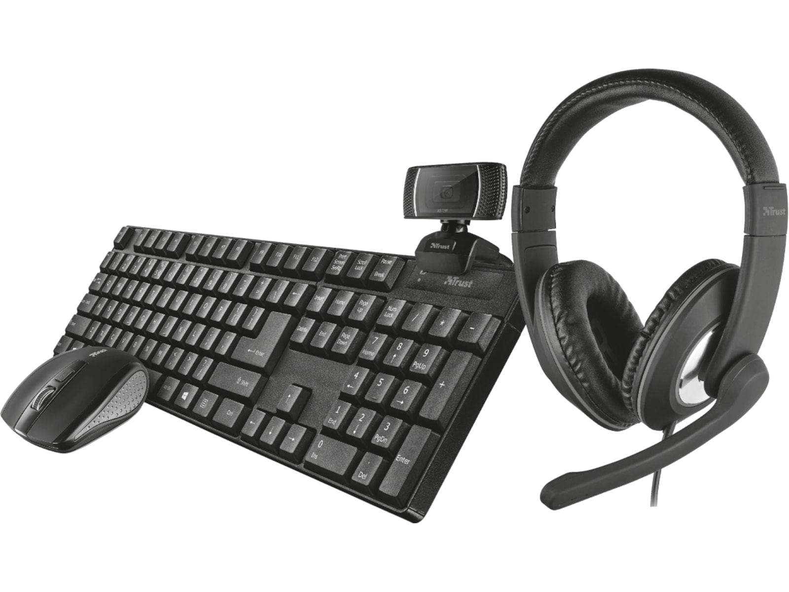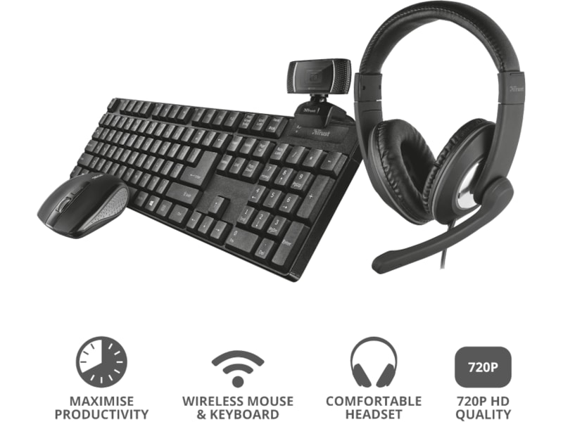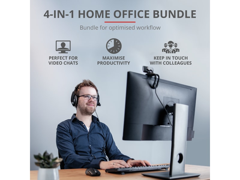 Med Trust Qobi 4-i-1 hjemmekontorsættet har du alt, hvad du behøver til problemfrit arbejde hjemmefra. Dette sæt inkluderer Trino HD-webkameraet, Reno-headsettet og det trådløse Ximo-tastatur- og musesæt. Fire ting, der gør arbejdet hjemmefra til en leg.