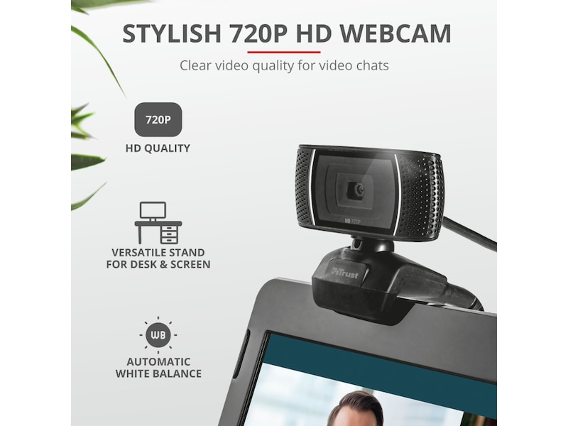 Trino HD Webcam er praktisk under videoopkald. Dette 720p webcam bruger en automatisk hvidbalance til at skabe klare videoer under alle lysforhold. Det leveres med et praktisk stativ, der fastgør det til din skærm.