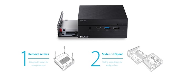 Et enkelt kabitet gør det let at opgradere eller tilføje en M.2 SSD, 2,5-tommer HDD eller SDD ved hjælpe af en skruetrækker på to enkle trin. En barebone*-version er også tilgængelig, så du selv kan opbygge din perfekte maskine.