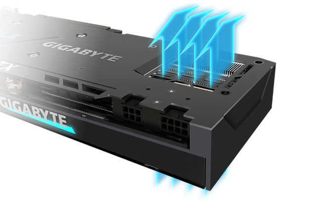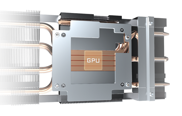 Med direkte kontakt til GPU og VRAM kan den store kobberplade kombinere de sammensatte varmerør for effektivt at overføre varmen der opstår fra de indre kerner ud til varmeaflederen.