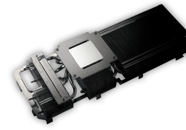 Varmesprederen trækker varmen op i varmeledninger, der fører den gennem en finnestak, der fylder det meste af kortets store fodspor på 2,7-slot.