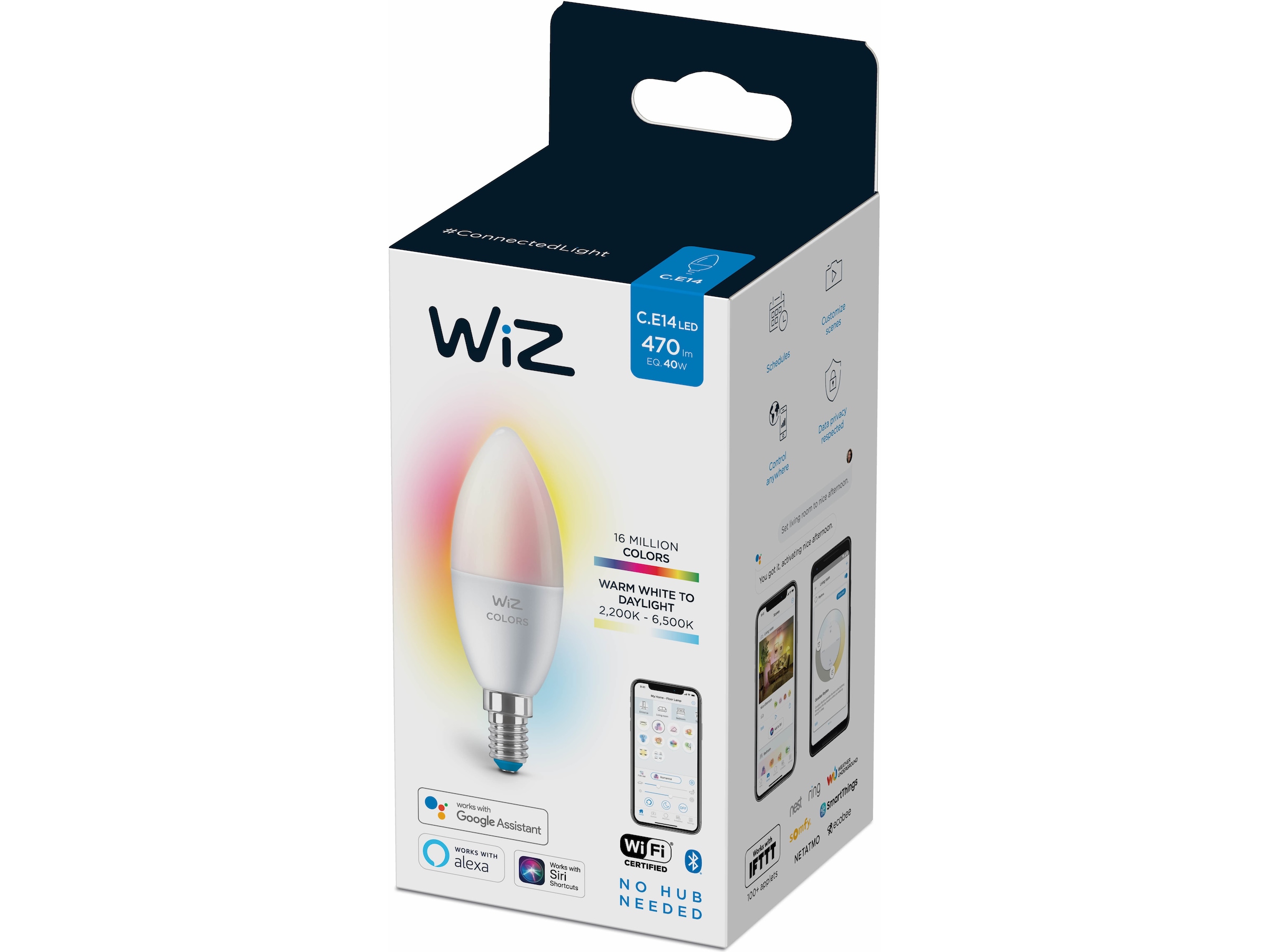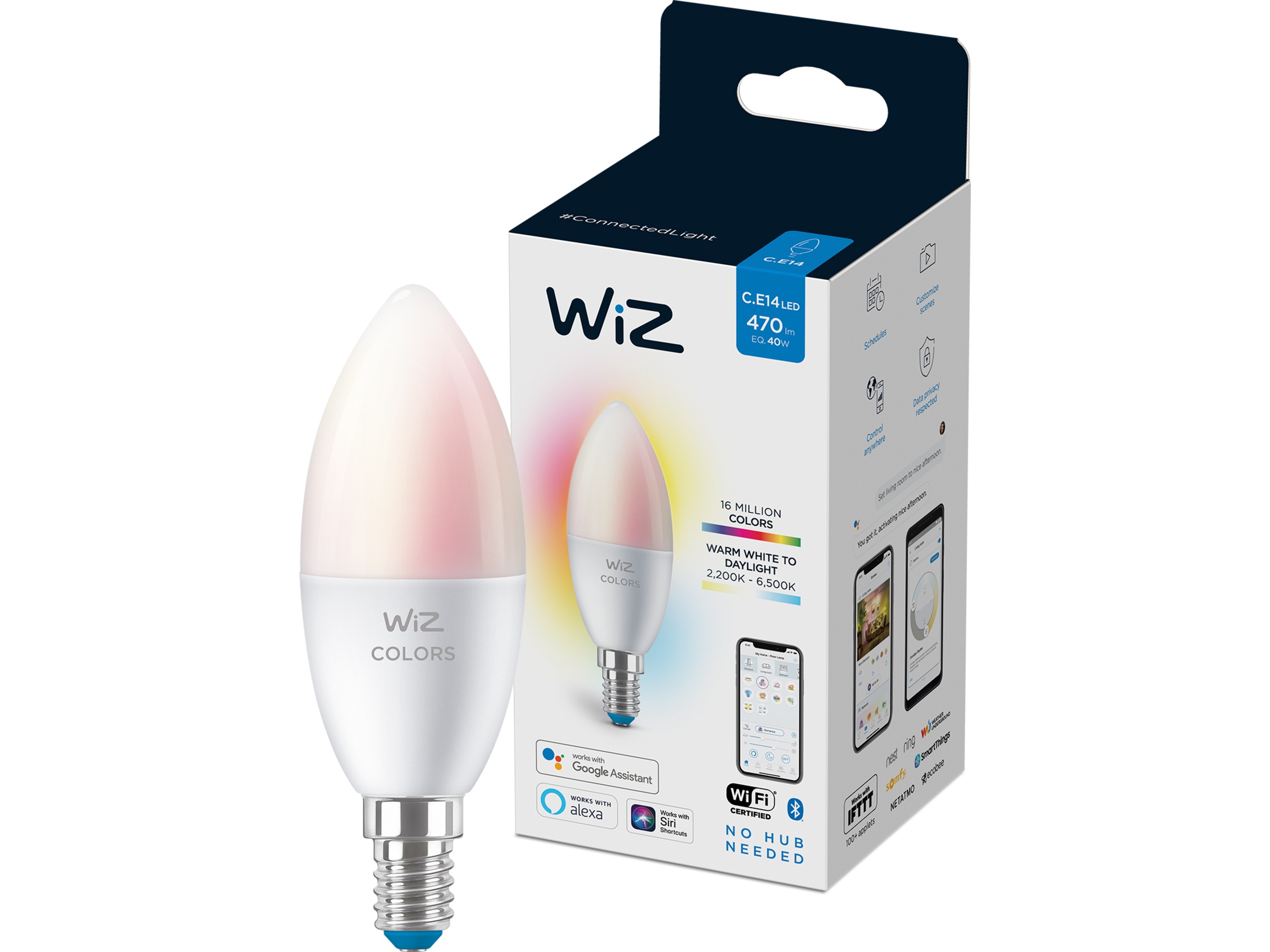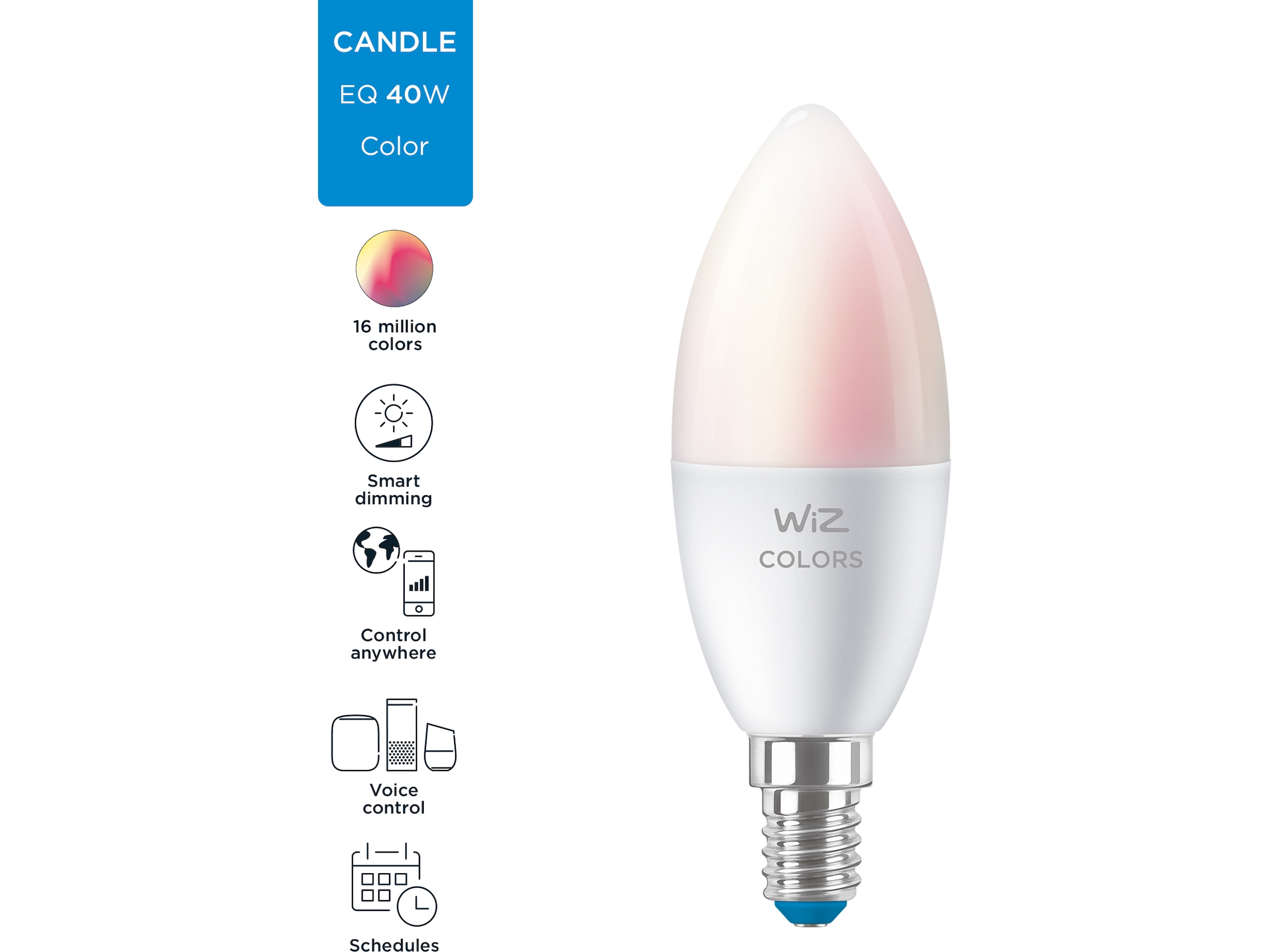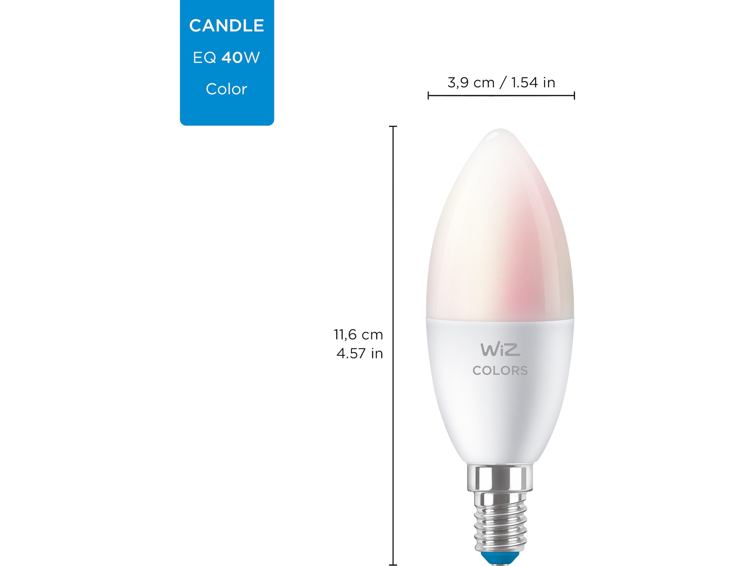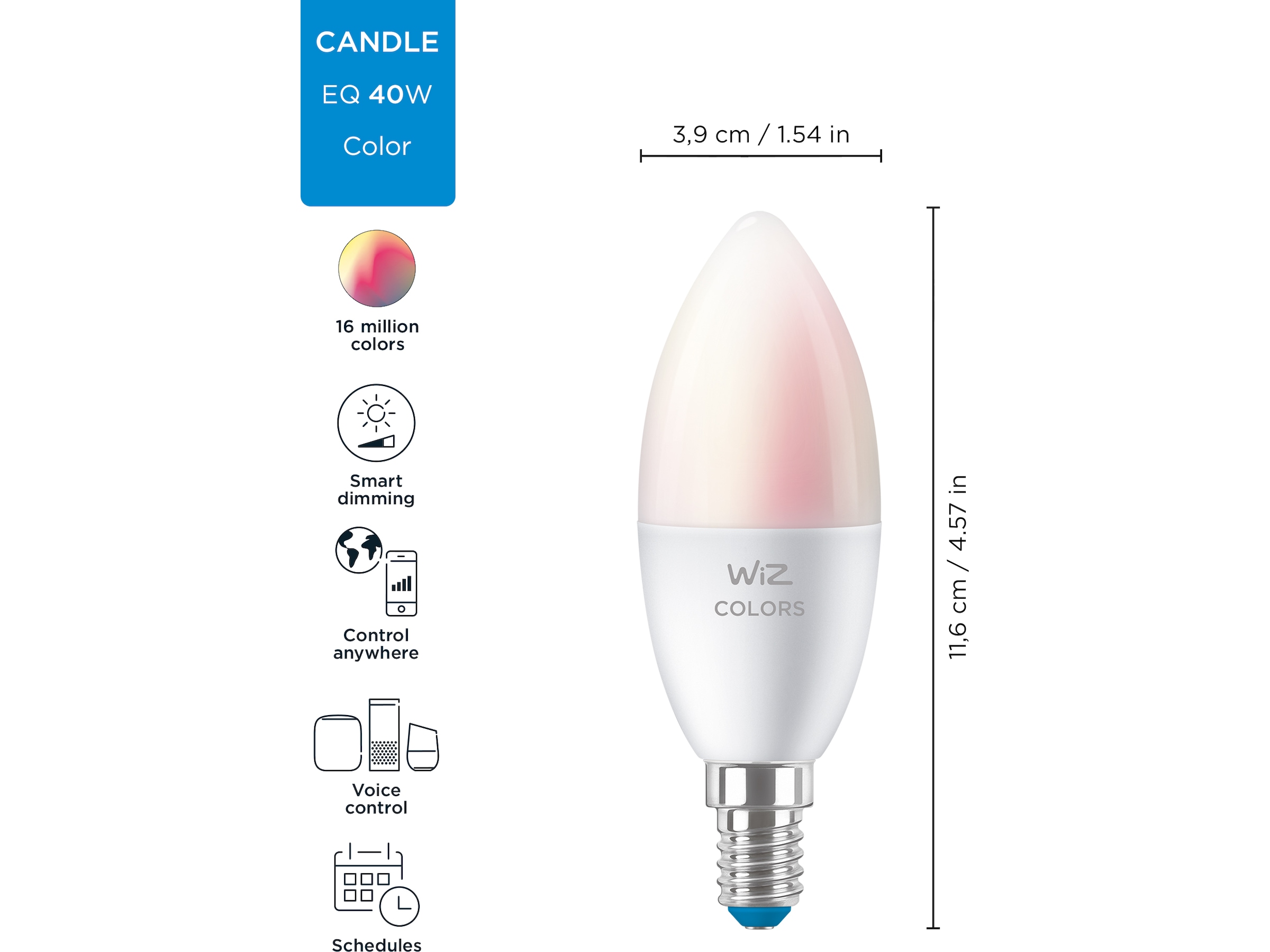 Få dit hjem til at funkle med strålende farverig stemningsbelysning med serien af WiZ full color intelligente pærer. Med denne kerteformede pære kan dine lysekroner og mindre lamper med E14 fatninger lyse i 16 millioner farver og med den helt rette lystemperatur, så du endelig får LED belysning i fantastisk høj kvalitet, som du fortjener.