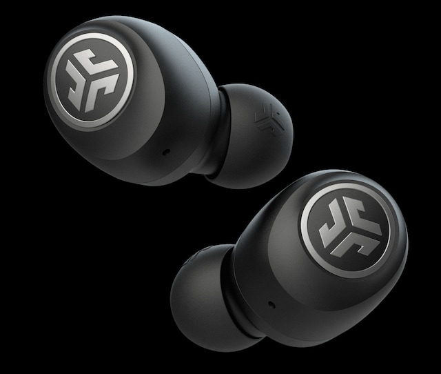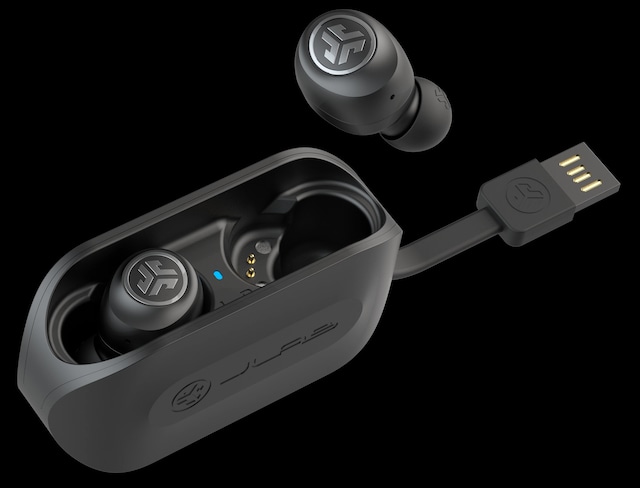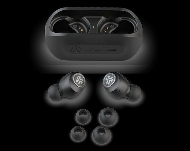 INDEHOLDER:GO Air Earbuds, opladningsetui m/integreret opladerkabel, 3 sæt Gel-spidser: Lille, mellemstor, stor, JLab to års garanti.