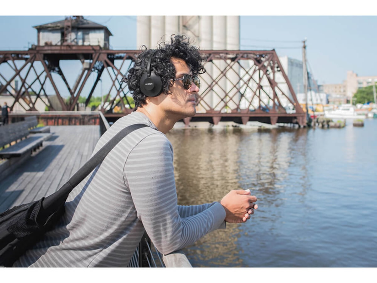Et nyt, vellykket trådløst headset med indbygget mikrofon og knapper til styring af opkald, spor og lydstyrke.
